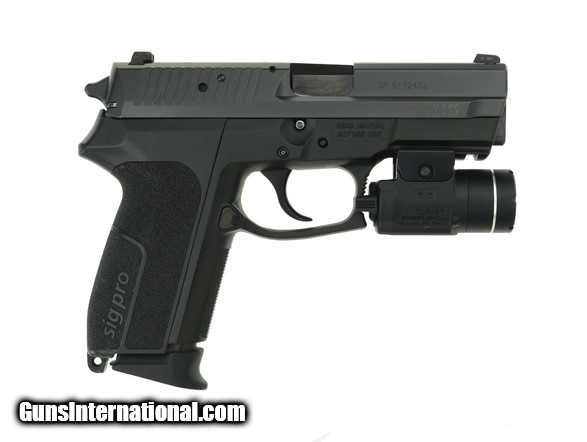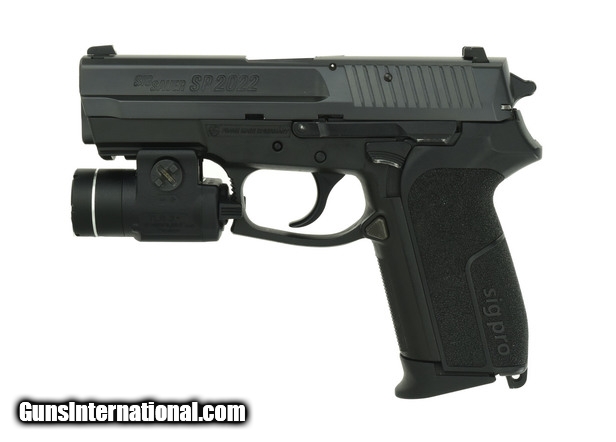Description: Sig Sauer SP2022 9mm caliber pistol. Polymer duty pistol with night sights, TLR-3 weapon light, box, and extra magazine in excellent condition.