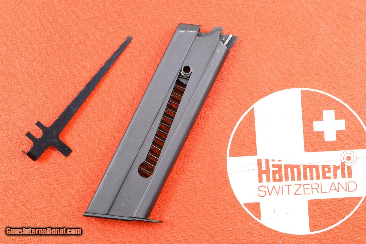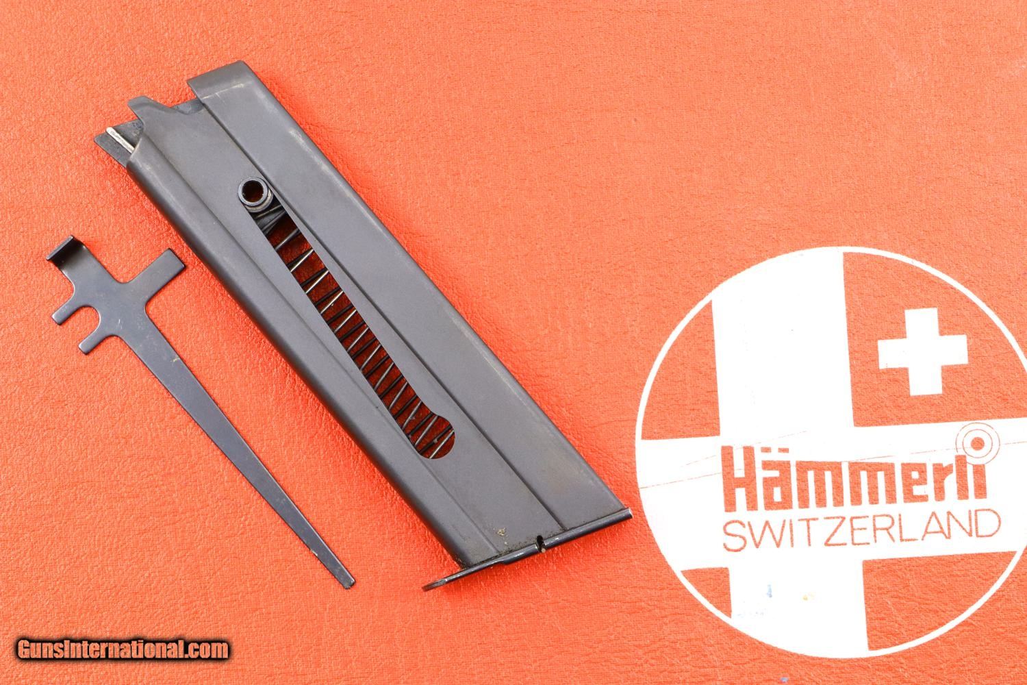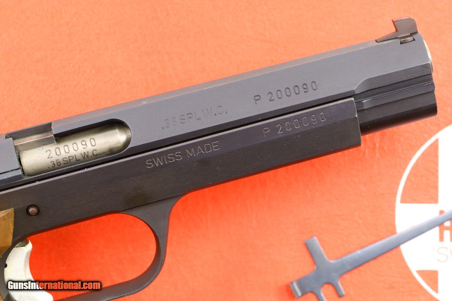 Description: Synopsis: Massive SIG Hammerli, P240 Target Pistol, Boxed, P200090, FB01002 Description: The SIG Hammerli P240 target pistol, designed by SIG, was manufactured by its Hammerli subsidiary in Lenzburg. It is estimated that fewer than 3,000 pistols in .38 Special WC were manufactured in total, this example one of the earliest guns made in/before 1975. This is a standard configuration pistol, with fully adjustable target grade sights, manufacturer reference on the left side of the slide, SN and caliber repeated on the right side of the barrel and slide, the serial number on the frame. Fitted with smooth oversized ergonomic grips. Typical SIG designed magazines with a zippered spine. Takedown tool. Pistol and tool boxed in a red/white Hammerli 230 box having end label that matches the pistol SN. Condition: 99+% original blue with comparable condition grips. Magazine with insertional wear on its spine. Mirror bore. Correct manual mechanics. Note that the magazine does not engage the hold open, as correct for this variation. Crisp shipping box with disintegrating foam. A massive, top condition and scarce target pistol that should appeal to every collector of Swiss/high end precision firearms! ~~Insured shipping fee of $75; most packages shipped using FedEx 2nd Day.~~ SOLD Manufacturer: SIG Serial Number: P240 Caliber Info: .38 SPL W.C. |