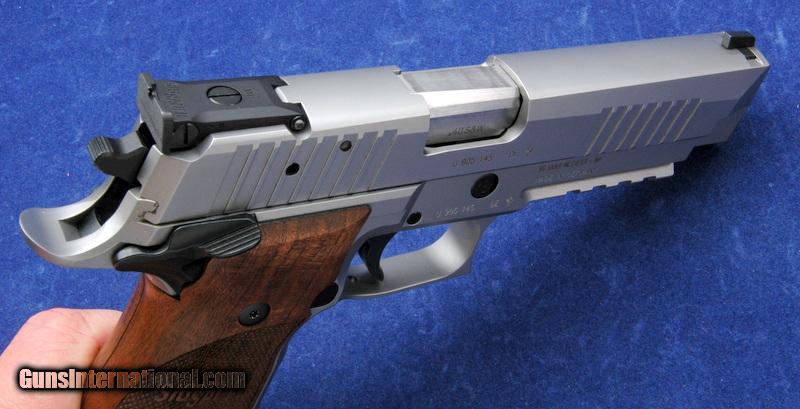 Description: Available for purchase is the pictured Sig X5 chambered in .40. This is a sweet competition pistol. All stainless steel, so it's a heavy sucker. Single action only with a very nice single action pull, Approx 3 lbs I'll wager. Ambidextrous safety in the 1911 style. Fully adjustable rear sight, big mag well. Walnut grips It comes with the original box, outer box, test target, 3 mags and all paperwork that came with it when new. It is in mint condition in and out. $35 shipping to the lower 48 and 3% surcharge for using a CC. SOLD |