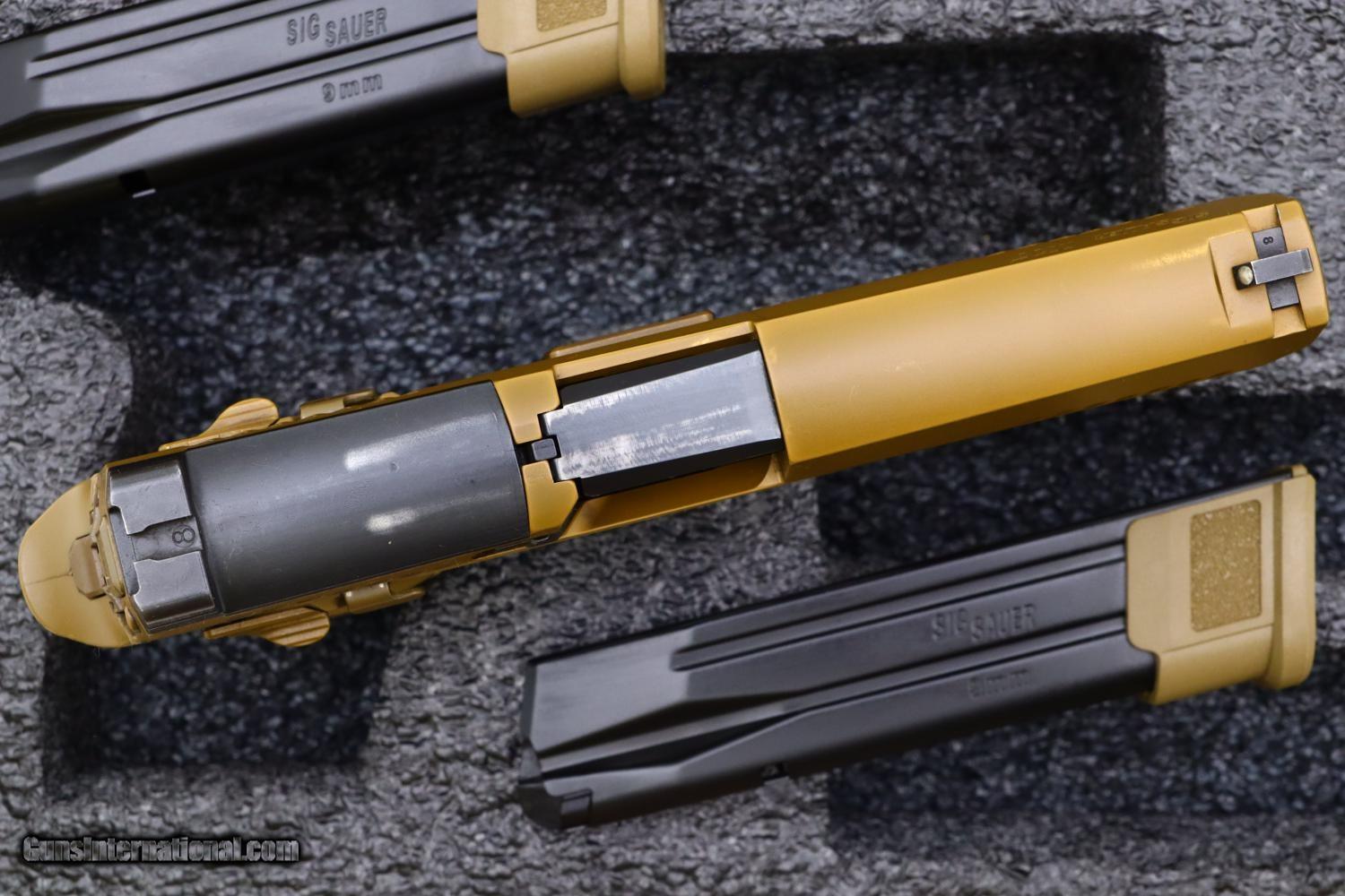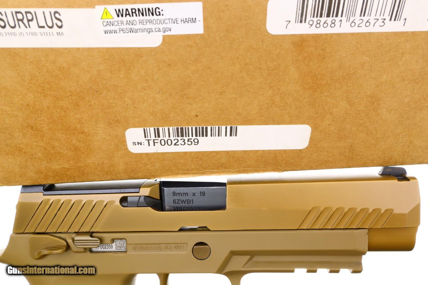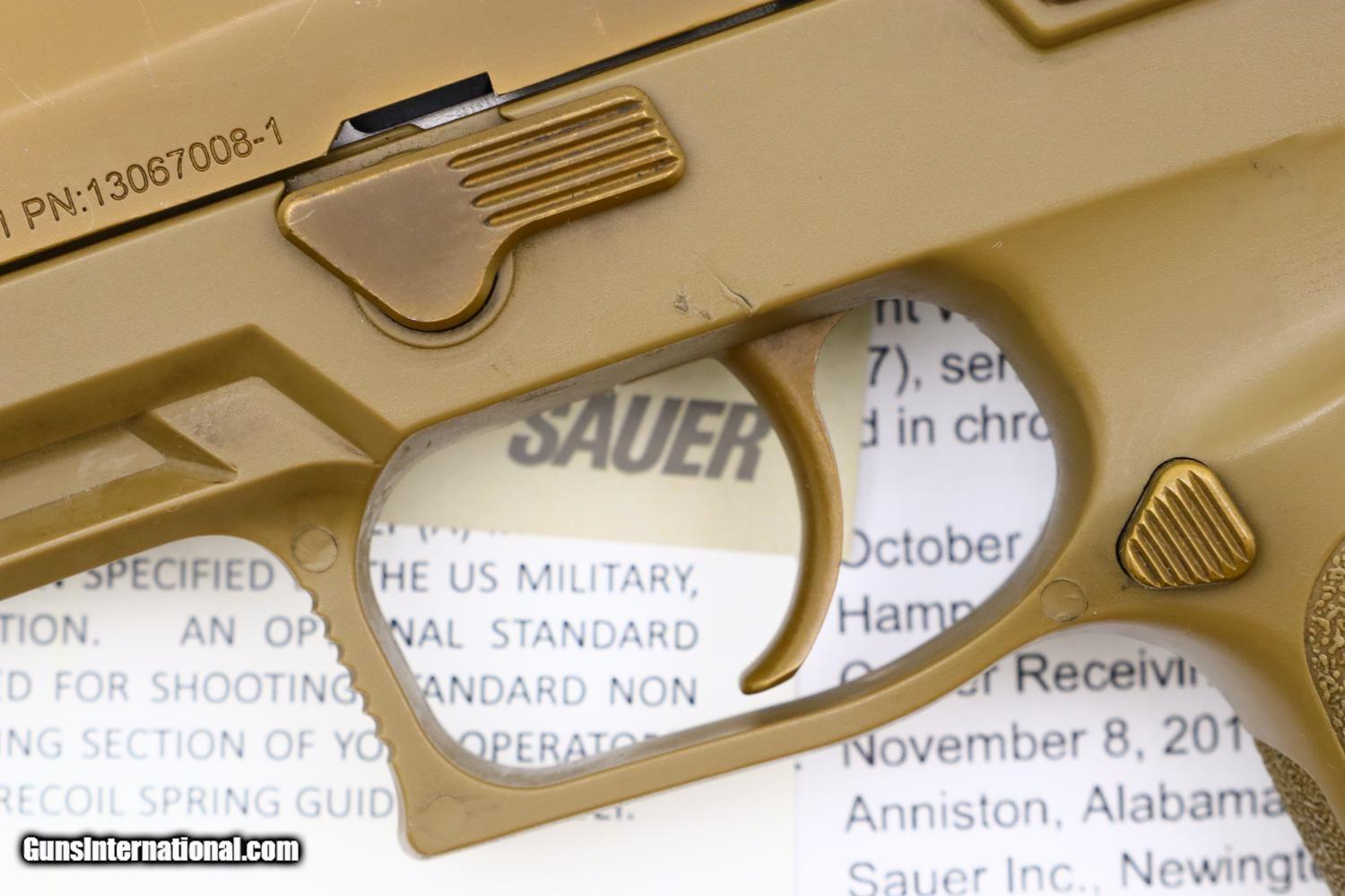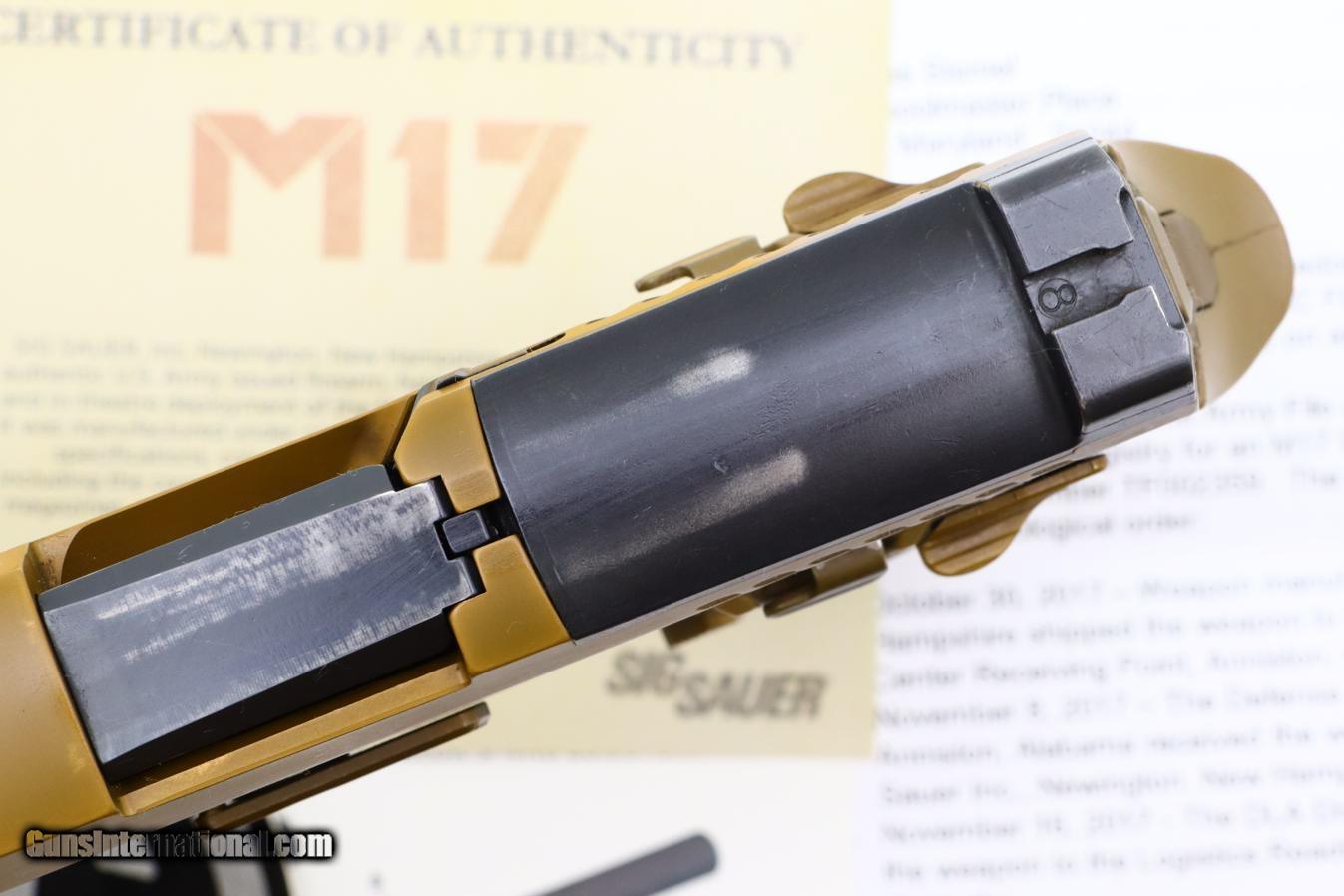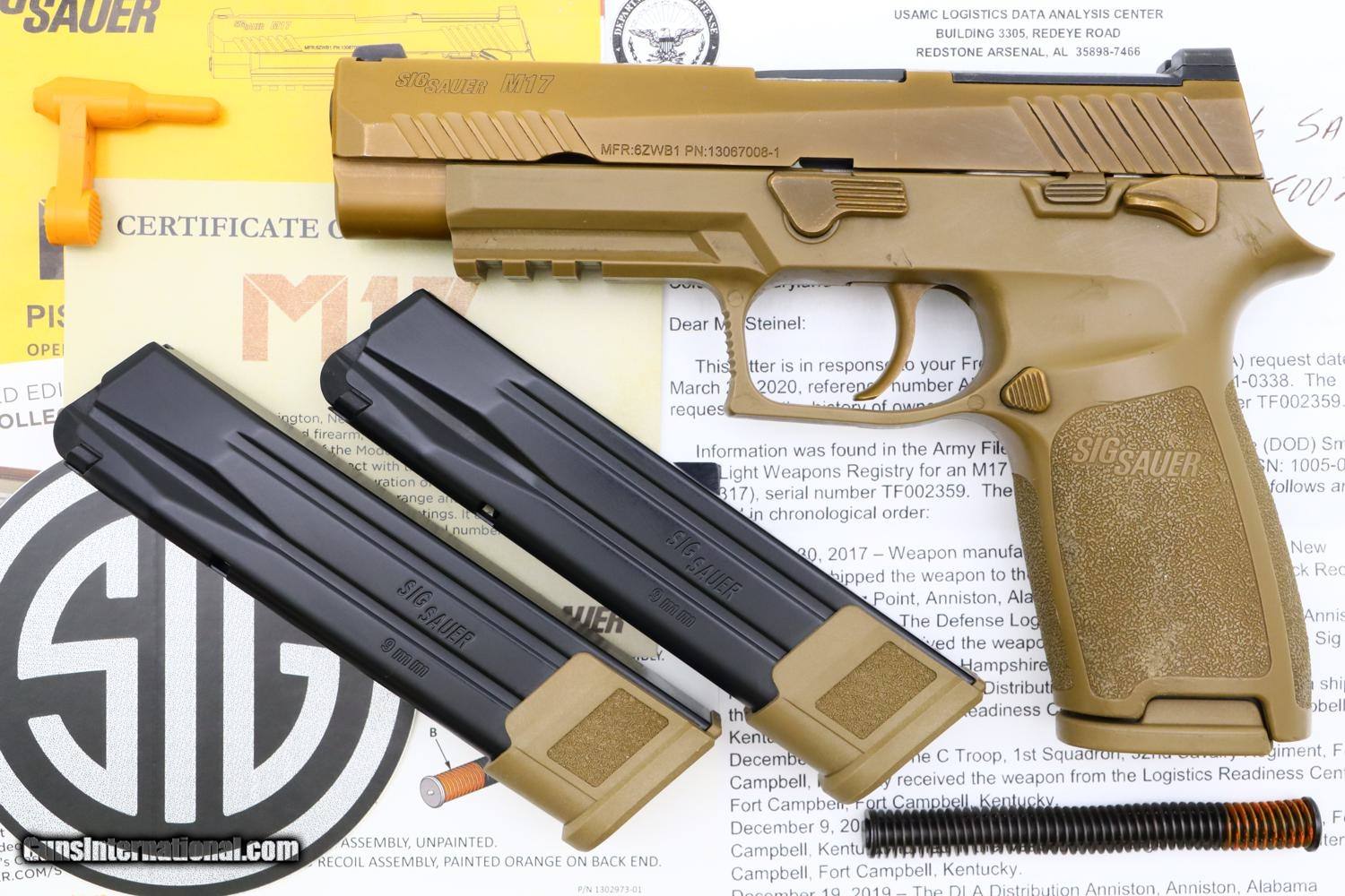 Description: Synopsis: Wonderful and Complete SIG, M17, Boxed, Accessories, TF002359, FB00566 Description: This SIG SAUER M17 was one of the first 5000 pistols issued to the U.S. Military, later recalled, reviewed by SIG SAUER, then boxed with all original accessories before being resold commercially. As true for all of the recalled pistols, it is numbered in the TF00 serial range and has all the small cerokoted small parts. Other standard features include the highlighted night sights, red dot capability, and an interchangeable frame, this one designated M (medium). Complete as issued with two spare 21 shot magazines, spare recoil spring/guide, usual assorted literature, sticker, lock, and plug Included is a Freedom Of Information Act letter giving the complete history of this pistol showing issues to C Troop 1st Squadron, 2nd Calvary Regiment, Fort Campbell, Kentucky. Matching box with clearly marked end labels. Condition: Near EXC original condition with sharp edge wear and scuffs consistent with a pistol that has seen minimal military use. Mirror bore. Perfect manual mechanics. Spare magazines and literature in better condition. Near EXC box with matching and crisply marked labels. A wonderful opportunity to own a real U.S. Military small arm as issued to our troops. ~~Insured shipping fee of $75; most packages shipped using FedEx 2nd Day.~~ SOLD Manufacturer: SIG Sauer Serial Number: TF002359 Caliber Info: 9mmx19 |