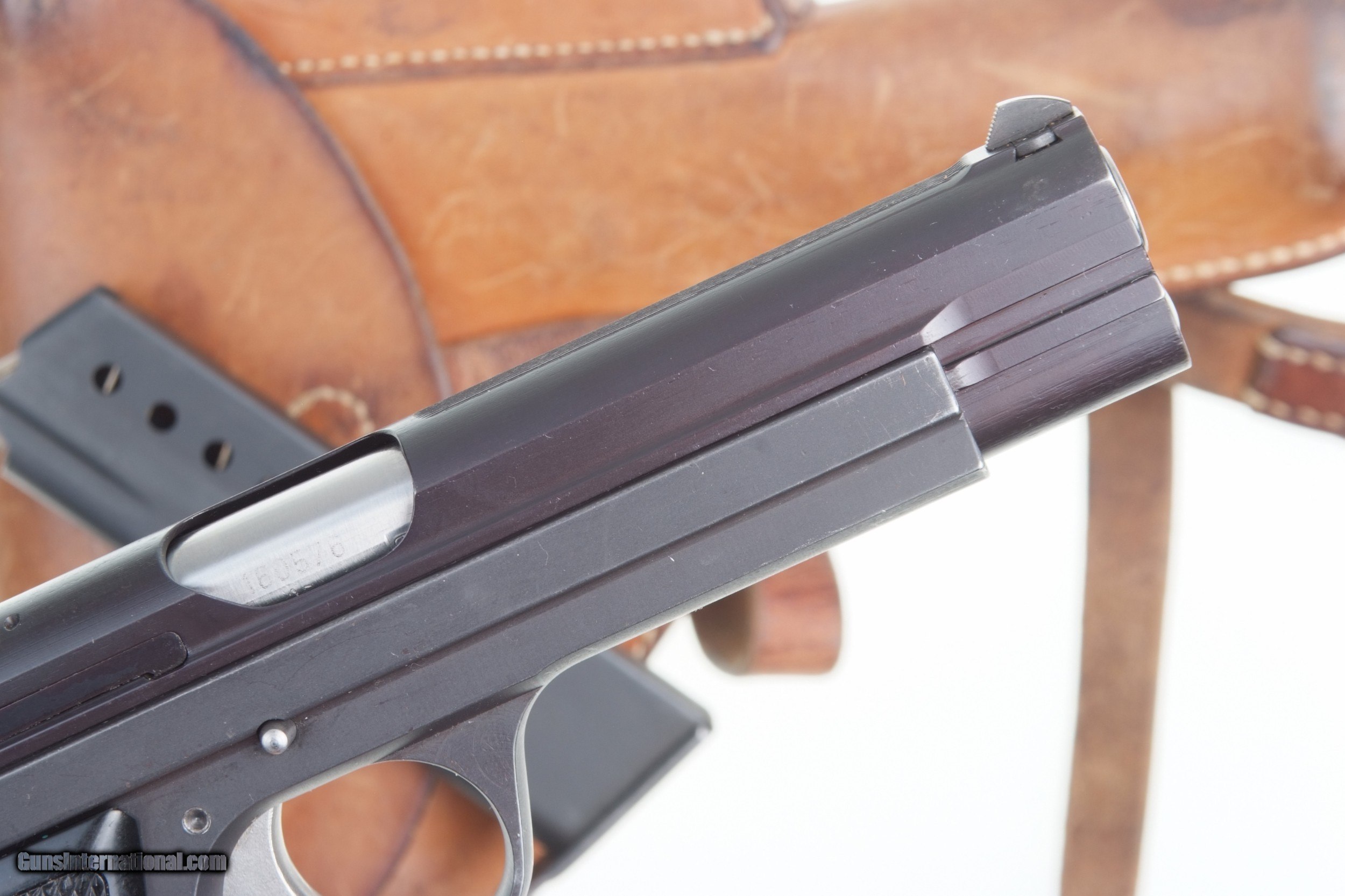 Description: All original and all matching SIG P49 with matte finish, original holster and strap. SN: A160576. Cal: 9mmP. Standard configuration single action pistol with 4.75” barrel and drift adjustable front and rear sight. The left side of the slide and frame are proofed and marked with the full serial number that is repeated on the right side of the barrel hood. Safety detents are marked with an “S” in white and “F” in red. “P” release marked on left side of trigger guard and discreetly applied import marking on base of frame where covered by the magazine floorplate. Disassembly shows a matching hammer group with the usual half cock. Fitted with checkered black plastic grips, separate escutcheons, secured with a single transverse screw. Fixed lanyard ring. Complete with one magazine. Original holster, manufacturer marked and dated “54” on obverse surface, strap dated “62”. No ownership markings inside lid. Condition: EXC original finish with minimal sharp edge wear as photographed. Comparable condition grips and original magazine. Mirror bore with strong rifling and perfect manual mechanics. VG+ holster with scuffs and staining as photographed, supple leather and original stitching. An excellent and all original Swiss Military P49 with a Swiss Military holster with shoulder strap. A HISTORIC INVESTMENT! Buyer pays $45.00 shipping SOLD Curio/Relic: Yes Manufacturer: Sig Model: P49 |