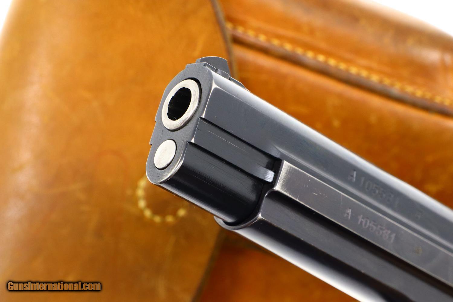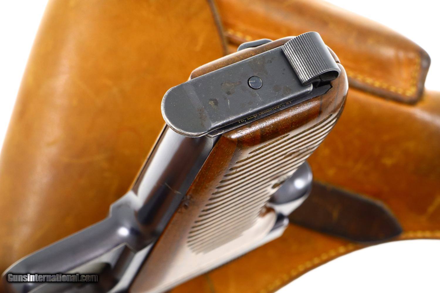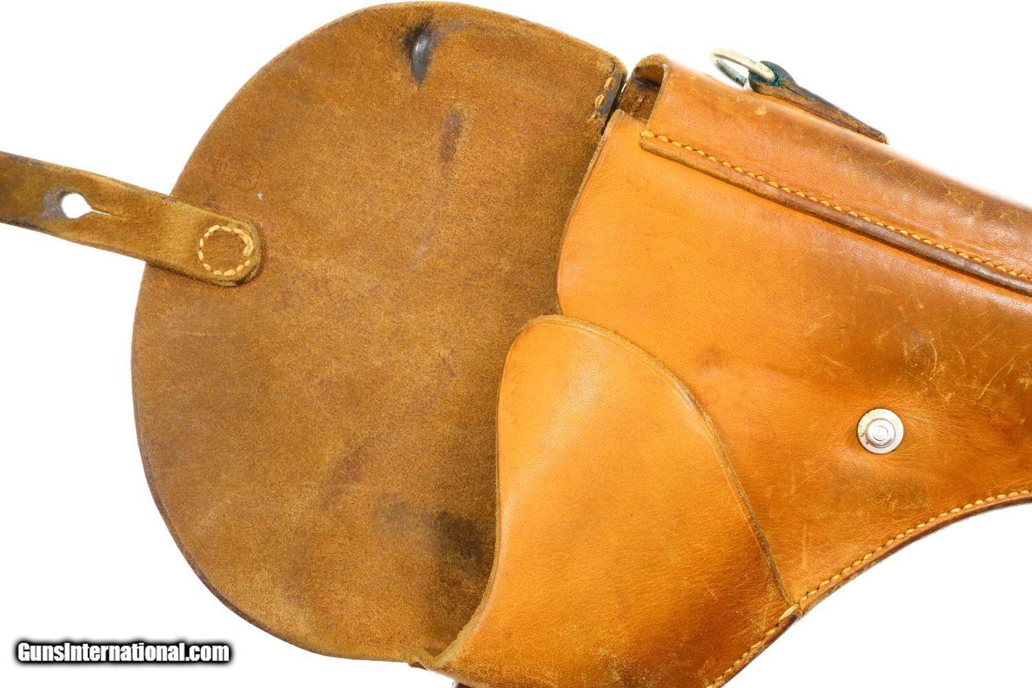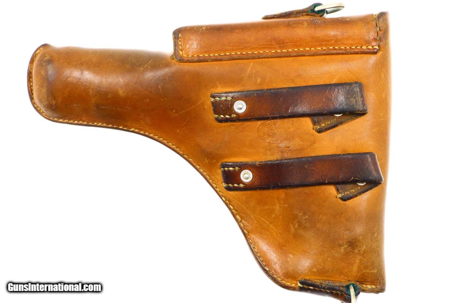Description: Synopsis: High original condition, Swiss Military P49 Rig, early high polish variation pistol, with updated/mismatched hammer group, spare magazine and holster. Description: Standard configuration single action pistol with 4.75” barrel and drift adjustable front and rear sight. The left side of the slide and frame are proofed and marked with the full serial number that is repeated on the right side of the barrel hood. Safety detents are marked with an “S” in white and “F” in red. “P” release is in front of the trigger guard. Disassembly shows an updated hammer group with half cock #20690. Fitted with serrated walnut grips secured with fire blued screw. Fixed lanyard ring. Complete with two matte magazines and a correct, dated "53" Swiss military holster. No shoulder strap. Condition: Approximately 97-98% original high polish blue, with sharp edge wear, in keeping with a service pistol that has seen relatively light use. Comparable condition grips, and later matte finish magazines, VG+ holster with intact stitching. Perfect manual mechanics with both magazines. ~~Insured shipping fee of $75; most packages shipped using FedEx 2nd Day.~~ SOLD Manufacturer: SIG Serial Number: A105581 Caliber Info: 9mmP |