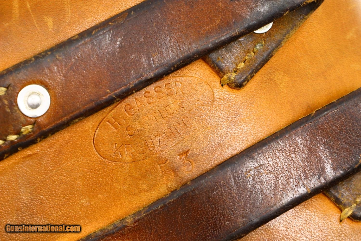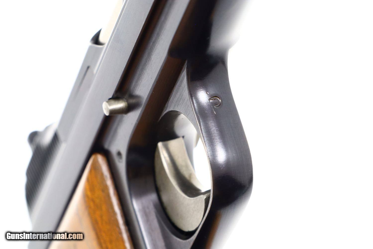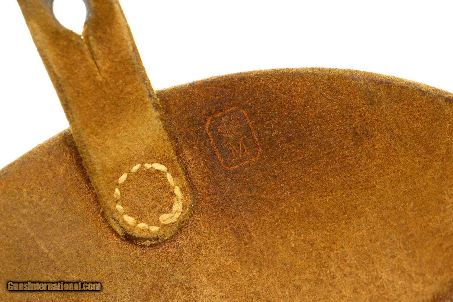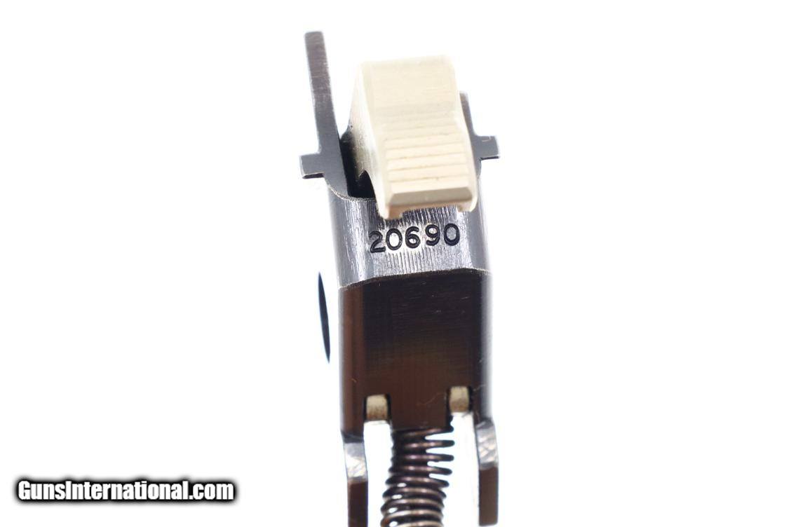 Description: Synopsis: High original condition, Swiss Military P49 Rig, early high polish variation pistol, with updated/mismatched hammer group, spare magazine and holster. Description: Standard configuration single action pistol with 4.75” barrel and drift adjustable front and rear sight. The left side of the slide and frame are proofed and marked with the full serial number that is repeated on the right side of the barrel hood. Safety detents are marked with an “S” in white and “F” in red. “P” release is in front of the trigger guard. Disassembly shows an updated hammer group with half cock #20690. Fitted with serrated walnut grips secured with fire blued screw. Fixed lanyard ring. Complete with two matte magazines and a correct, dated "53" Swiss military holster. No shoulder strap. Condition: Approximately 97-98% original high polish blue, with sharp edge wear, in keeping with a service pistol that has seen relatively light use. Comparable condition grips, and later matte finish magazines, VG+ holster with intact stitching. Perfect manual mechanics with both magazines. ~~Insured shipping fee of $75; most packages shipped using FedEx 2nd Day.~~ SOLD Manufacturer: SIG Serial Number: A105581 Caliber Info: 9mmP |