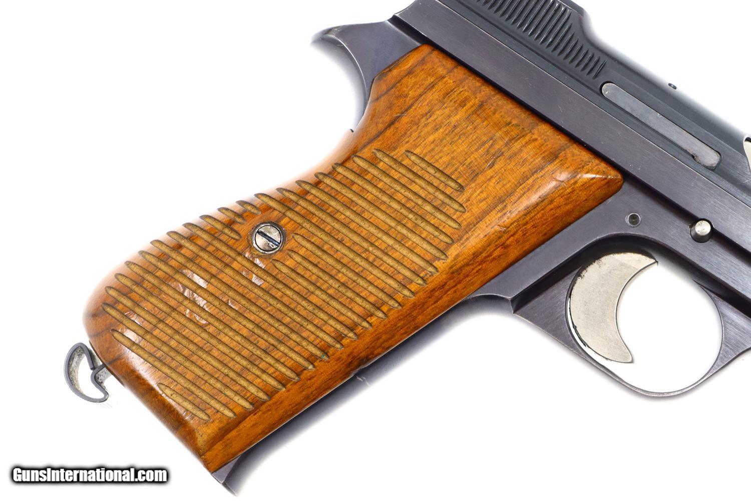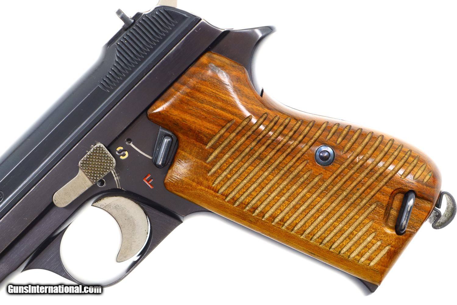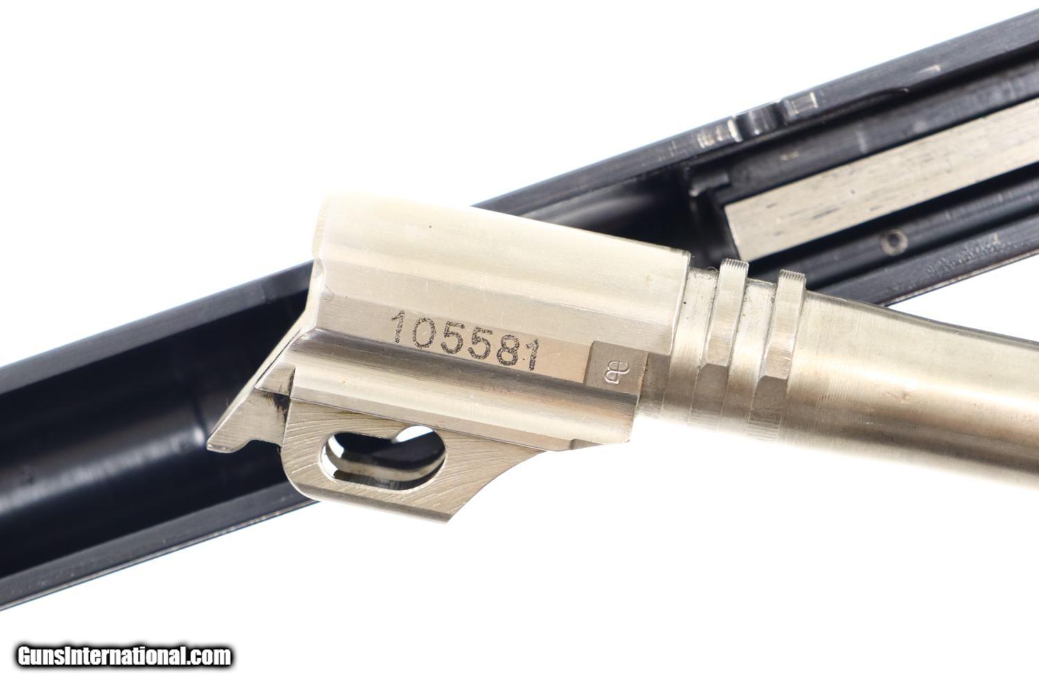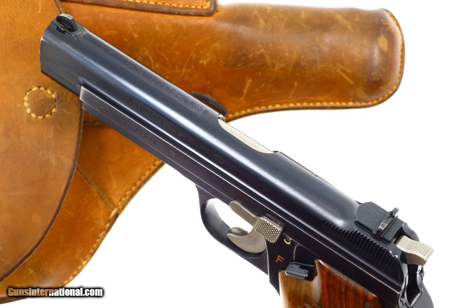 Description: Synopsis: High original condition, Swiss Military P49 Rig, early high polish variation pistol, with updated/mismatched hammer group, spare magazine and holster. Description: Standard configuration single action pistol with 4.75” barrel and drift adjustable front and rear sight. The left side of the slide and frame are proofed and marked with the full serial number that is repeated on the right side of the barrel hood. Safety detents are marked with an “S” in white and “F” in red. “P” release is in front of the trigger guard. Disassembly shows an updated hammer group with half cock #20690. Fitted with serrated walnut grips secured with fire blued screw. Fixed lanyard ring. Complete with two matte magazines and a correct, dated "53" Swiss military holster. No shoulder strap. Condition: Approximately 97-98% original high polish blue, with sharp edge wear, in keeping with a service pistol that has seen relatively light use. Comparable condition grips, and later matte finish magazines, VG+ holster with intact stitching. Perfect manual mechanics with both magazines. ~~Insured shipping fee of $75; most packages shipped using FedEx 2nd Day.~~ SOLD Manufacturer: SIG Serial Number: A105581 Caliber Info: 9mmP |
