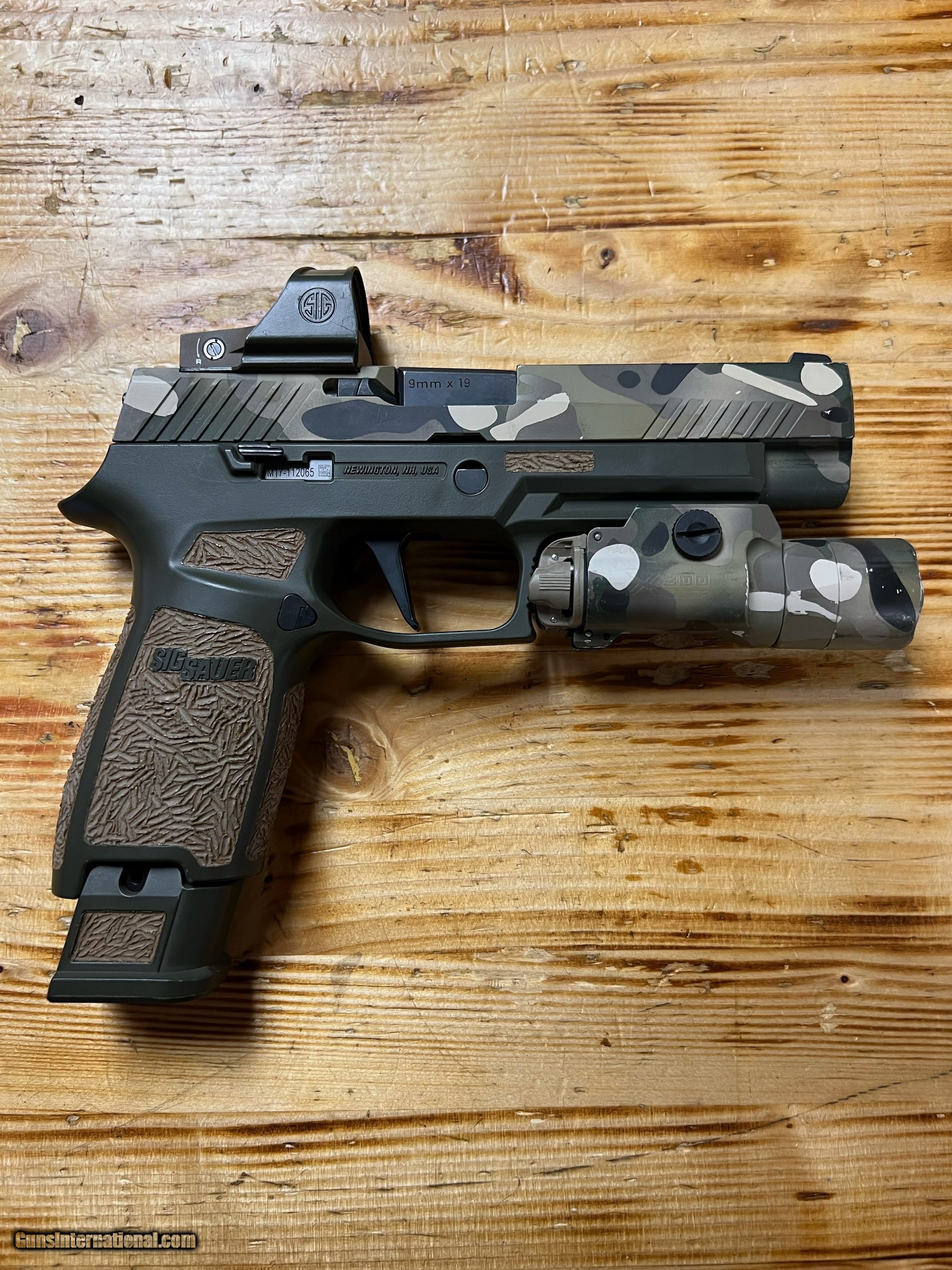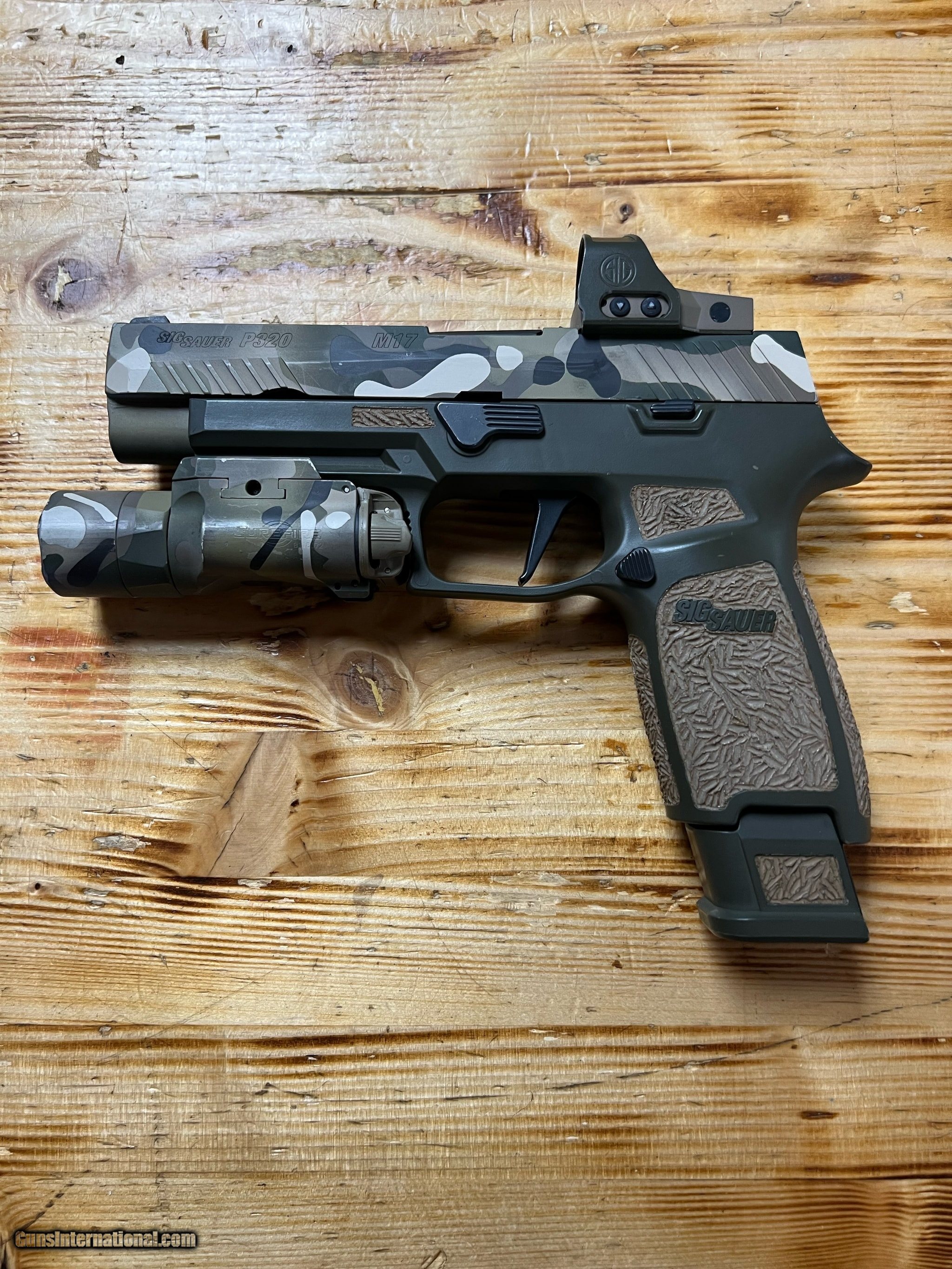 Description: Guns Listing ID: 687188 This firearm is in very good condition and only has some minor surface flaws in the finish. This was a factory M17 that was completely customized. This has been professionally Cerakoted and stippled as well. Features the flat trigger upgrade, Surefire X300U light with matching coating, Romeo 1 Pro, one stippled and coated 21 round magazine, as well as the original box. Coating is multicam and stipple is commonly referred to as the sprinkles pattern. Also includes a custom made kydex holster with Safariland belt adapter that is pictured. SOLD Manufacturer: SIG SAUER Model: M17 (P320) Caliber Info: 9MM Condition: Used - Non-Certified Barrels: 4.7 BARREL Finish: MULTICAM |