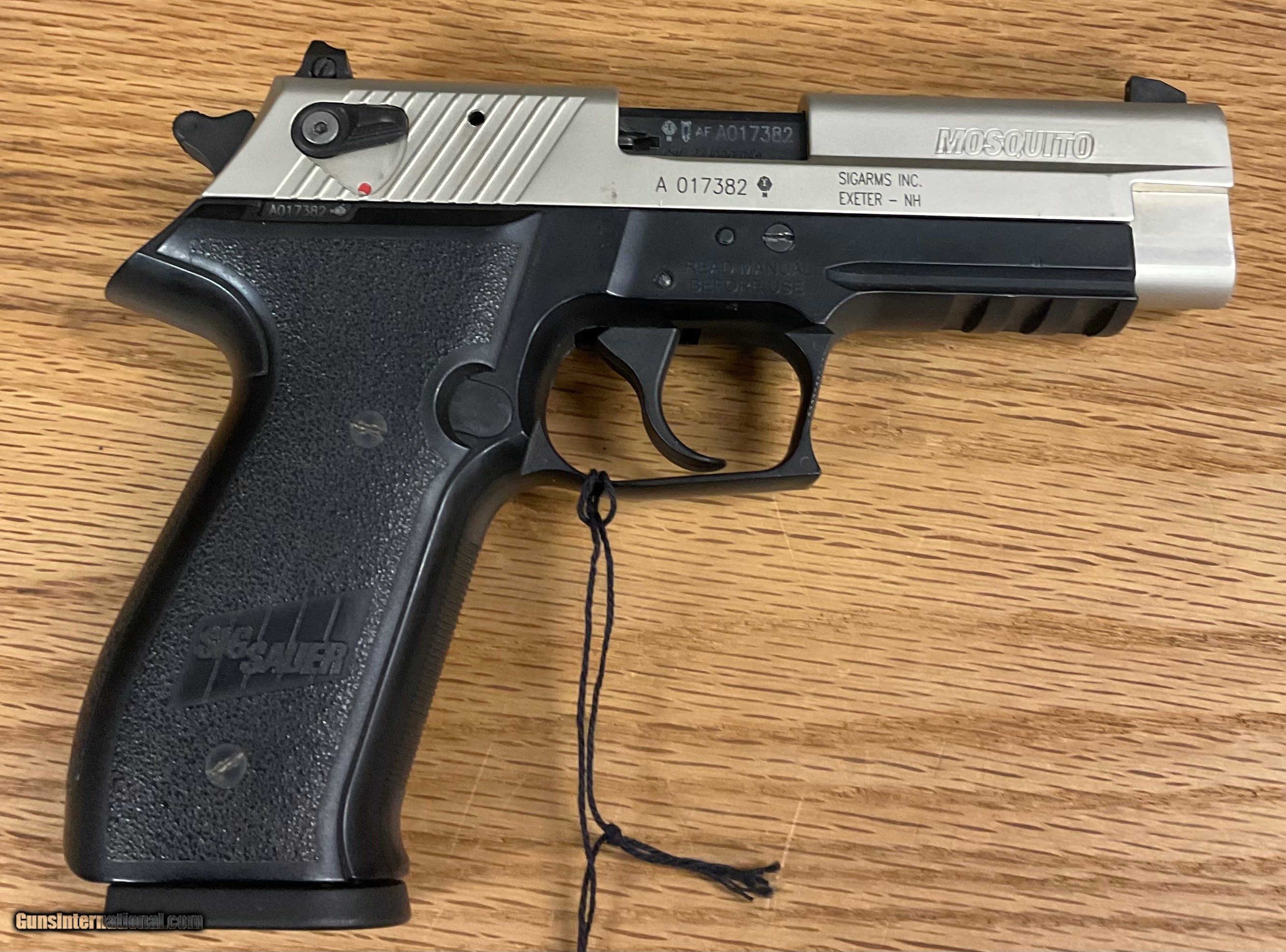 Description: Sig Sauer Mosquito DA/SA .22LR Pistol. Very good condition. See all photos for details. Buyer is responsible for a 35 dollar shipping charge. SOLD Handgun Caliber: .22 Long Rifle Manufacturer: Sig Sauer Model: Mosquito Serial Number: A017382 Barrel Length: 4” Condition: Very Good |