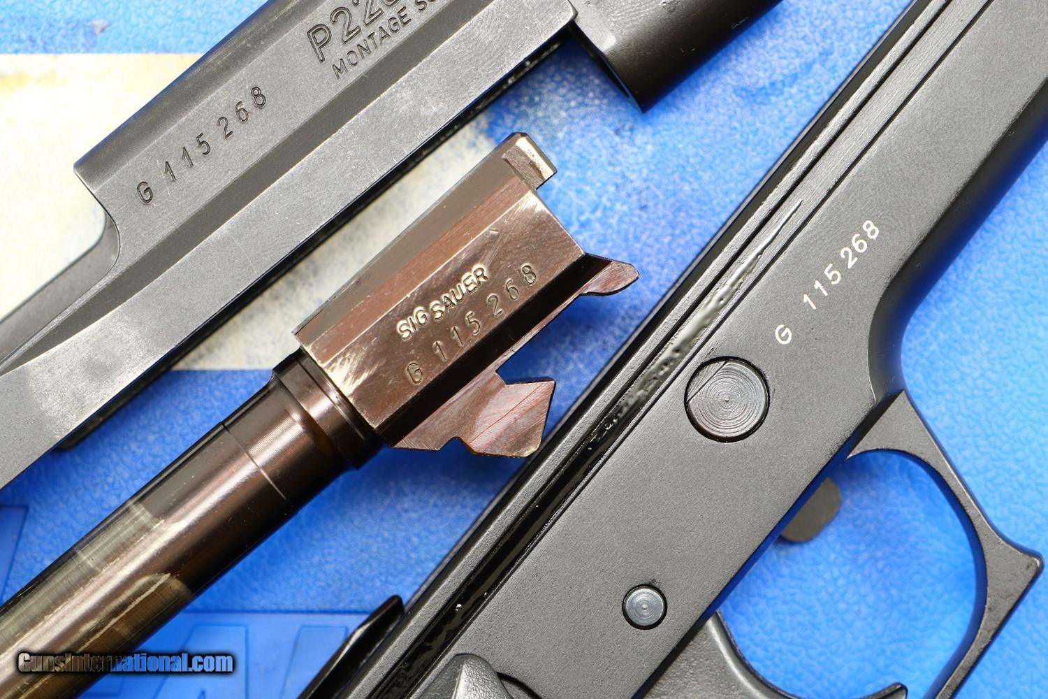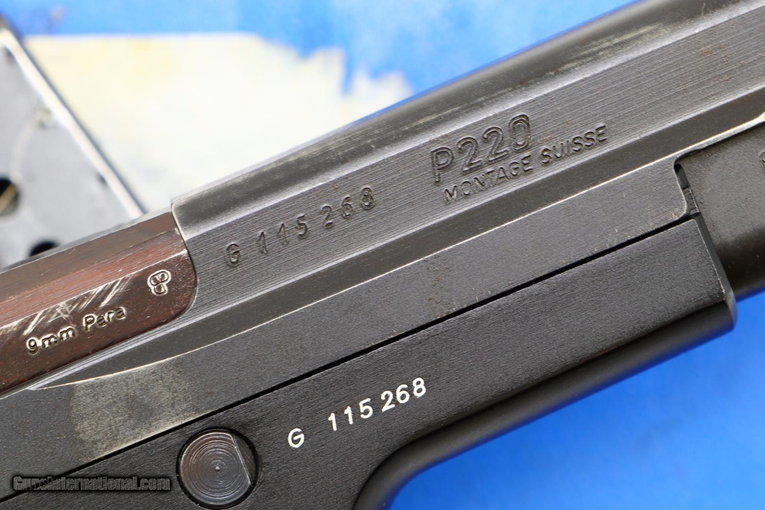 Description: Synopsis: SIG Sauer P220, Police, Late, Boxed, G115268, I-1239 Description: One of the later SIG Sauer P220s, this example with machined slide, assembled in Switzerland. Standard white highlighted front and rear sights. The left side of the slide is marked with a large eagle within a shield, wings outstretched, as used by the police of Neuchatel. The right side of the slide is marked to reflect assembly in Switzerland. Matching serial numbers on the barrel, slide and frame. Checkered black plastic grips. Correct SIG Sauer magazines with 8 indicator holes, a zippered spine, and a detachable floorplate. Correct blue shipping box. Condition: VG+ with sharp edge wear and thinning as one might expect from a service pistol that has seen light-moderate use. Surprisingly little wear to the anodized frame. Near excellent grips and comparable condition magazines. Bright bore with sharp rifling. Perfect manual mechanics. An extremely interesting and unusual late SIG P220 with police markings and guard for the magazine release as used by the border patrol. SOLD Manufacturer: SIG Sauer Model: P220 Serial Number: G115268 Caliber Info: 9mmP Condition: VG |