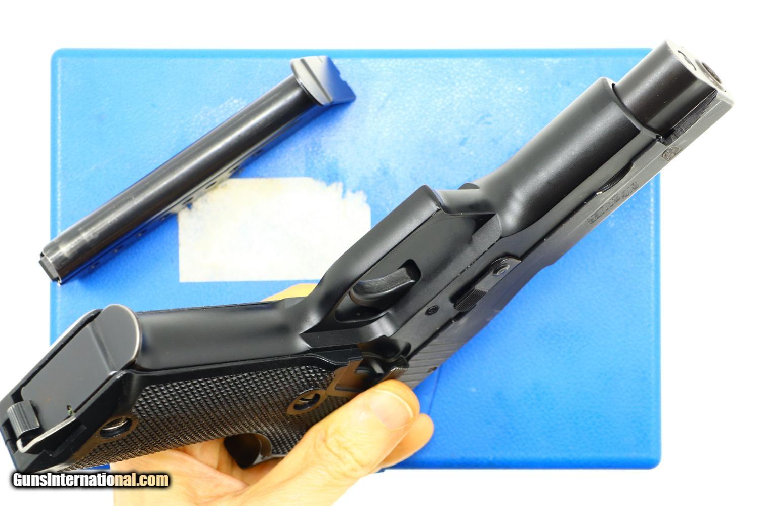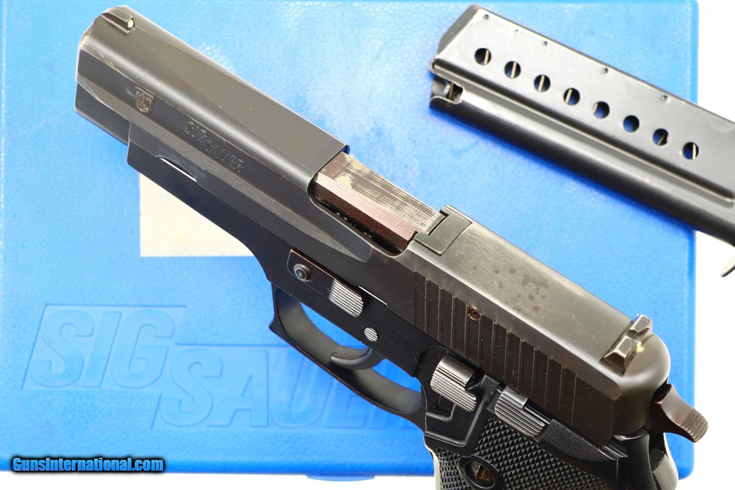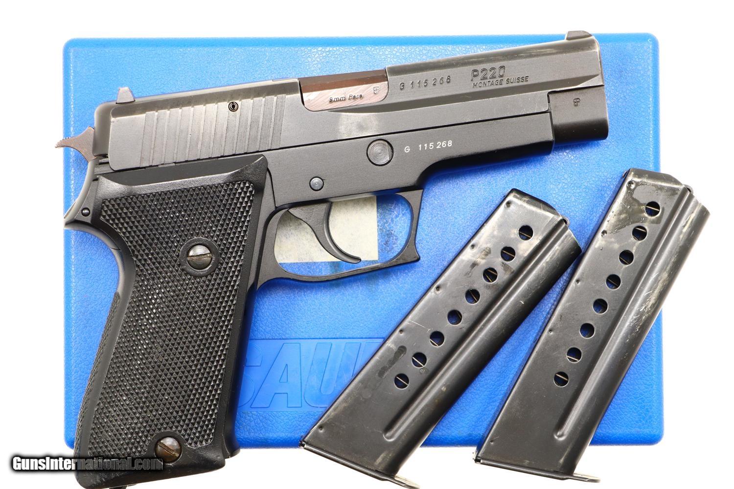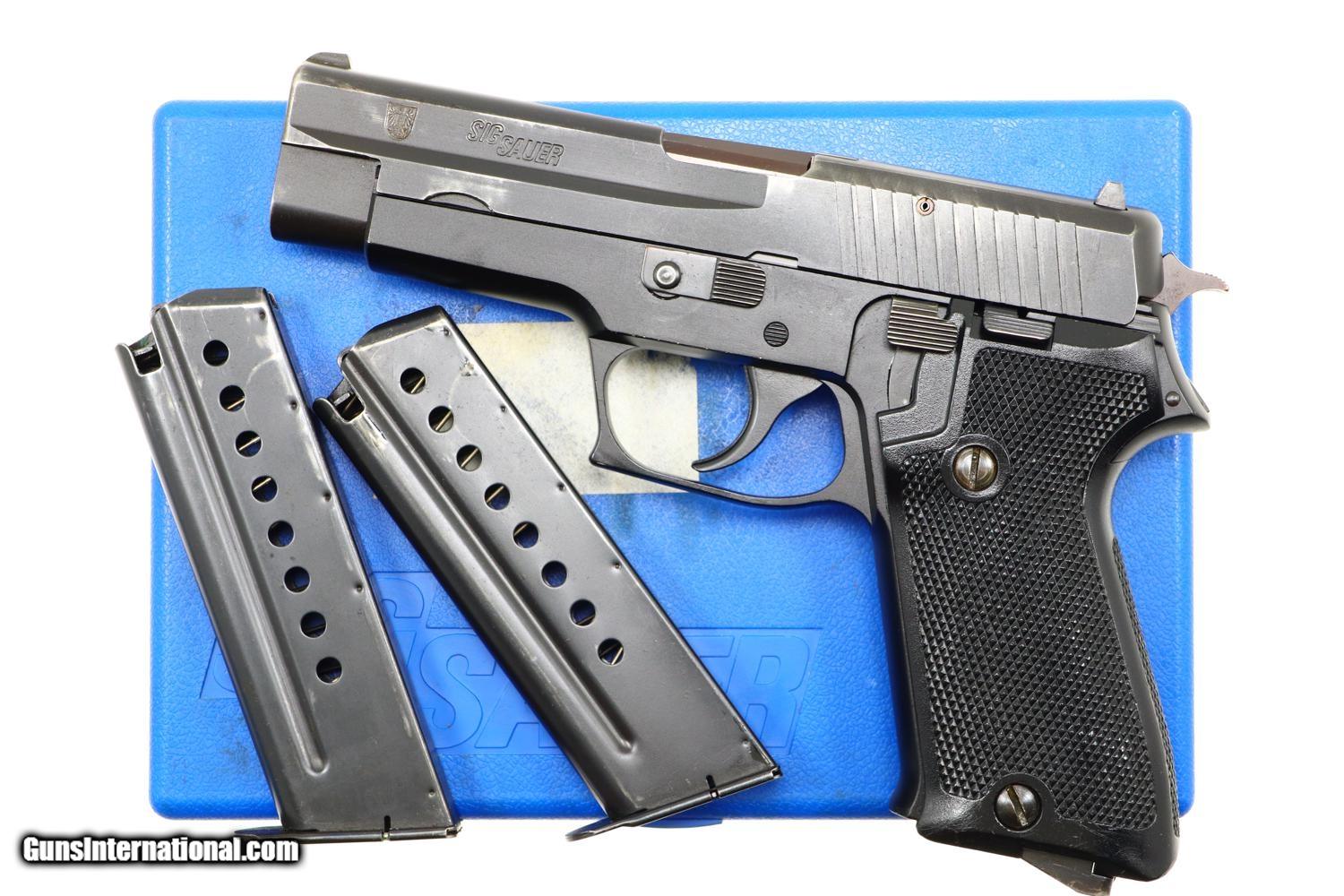 One of the later SIG Sauer P220s, this example with machined slide, assembled in Switzerland. Standard white highlighted front and rear sights. The left side of the slide is marked with a large eagle within a shield, wings outstretched, as used by the police of Neuchatel. The right side of the slide is marked to reflect assembly in Switzerland. Matching serial numbers on the barrel, slide and frame. Checkered black plastic grips. Correct SIG Sauer magazines with 8 indicator holes, a zippered spine, and a detachable floorplate. Correct blue shipping box.