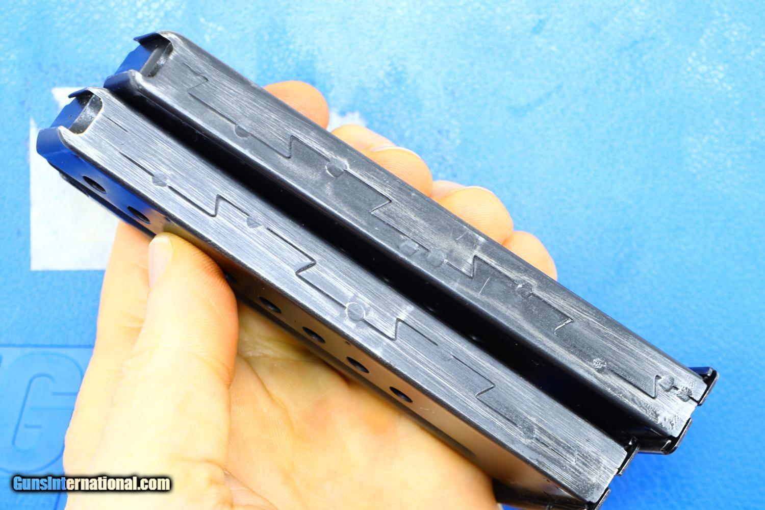 VG+ with sharp edge wear and thinning as one might expect from a service pistol that has seen light-moderate use. Surprisingly little wear to the anodized frame. Near excellent grips and comparable condition magazines. Bright bore with sharp rifling. Perfect manual mechanics. An extremely interesting and unusual late SIG P220 with police markings and guard for the magazine release as used by the border patrol.