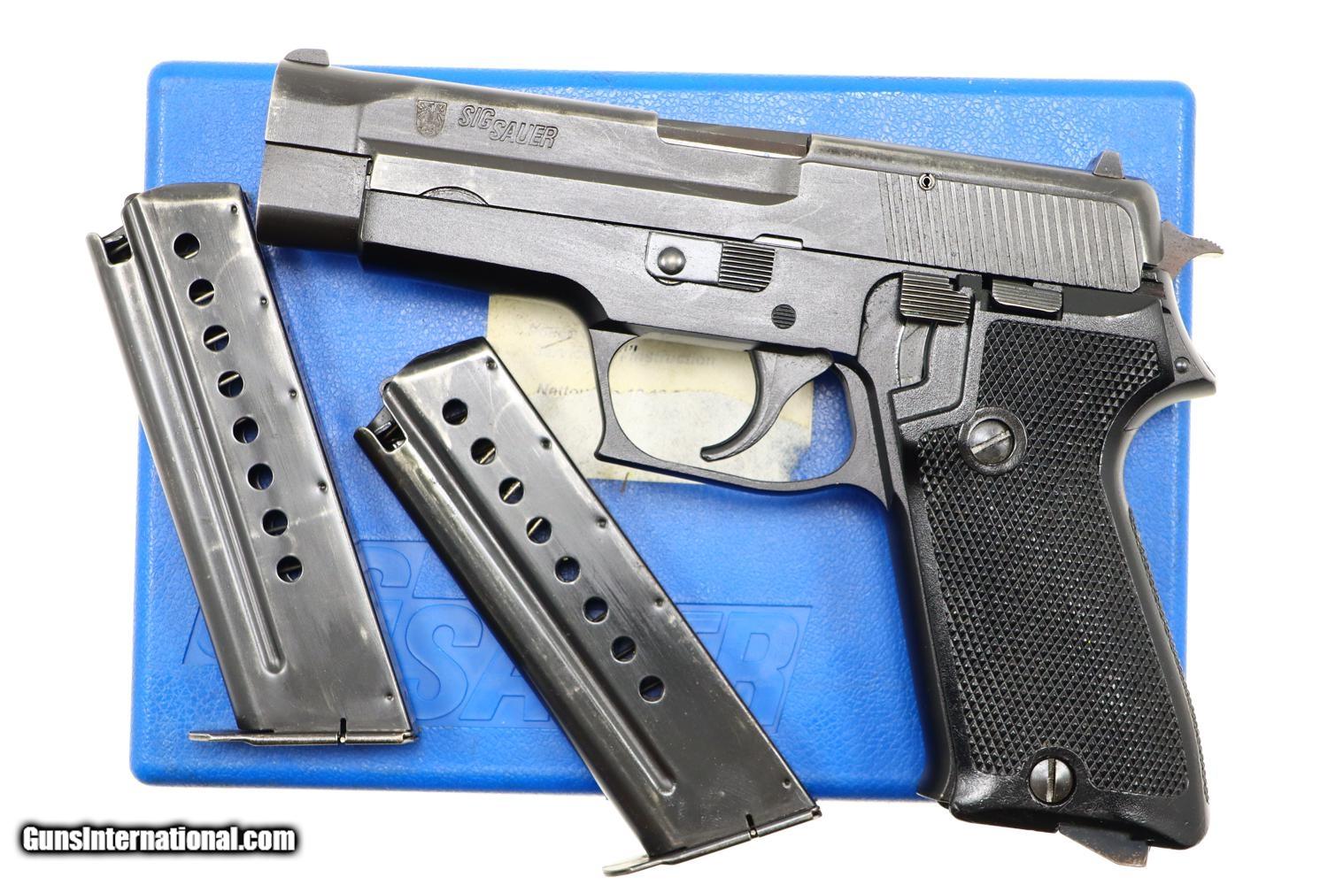 One of the earliest SIG Sauer P220s, this example with folded slide, assembled in Switzerland. Standard white highlighted front and rear sights. The left side of the slide is marked with a large eagle within a shield, wings outstretched, as used by the police of Neuchatel. The right side of the slide is marked to reflect assembly in Switzerland. Matching serial numbers on the barrel, slide and frame. Checkered black plastic grips. Correct SIG Sauer magazines with 8 indicator holes, a zippered spine, and a detachable floorplate. Correct blue shipping box.