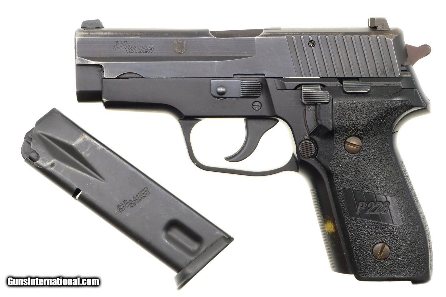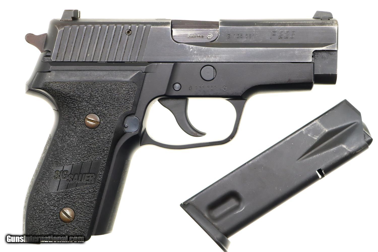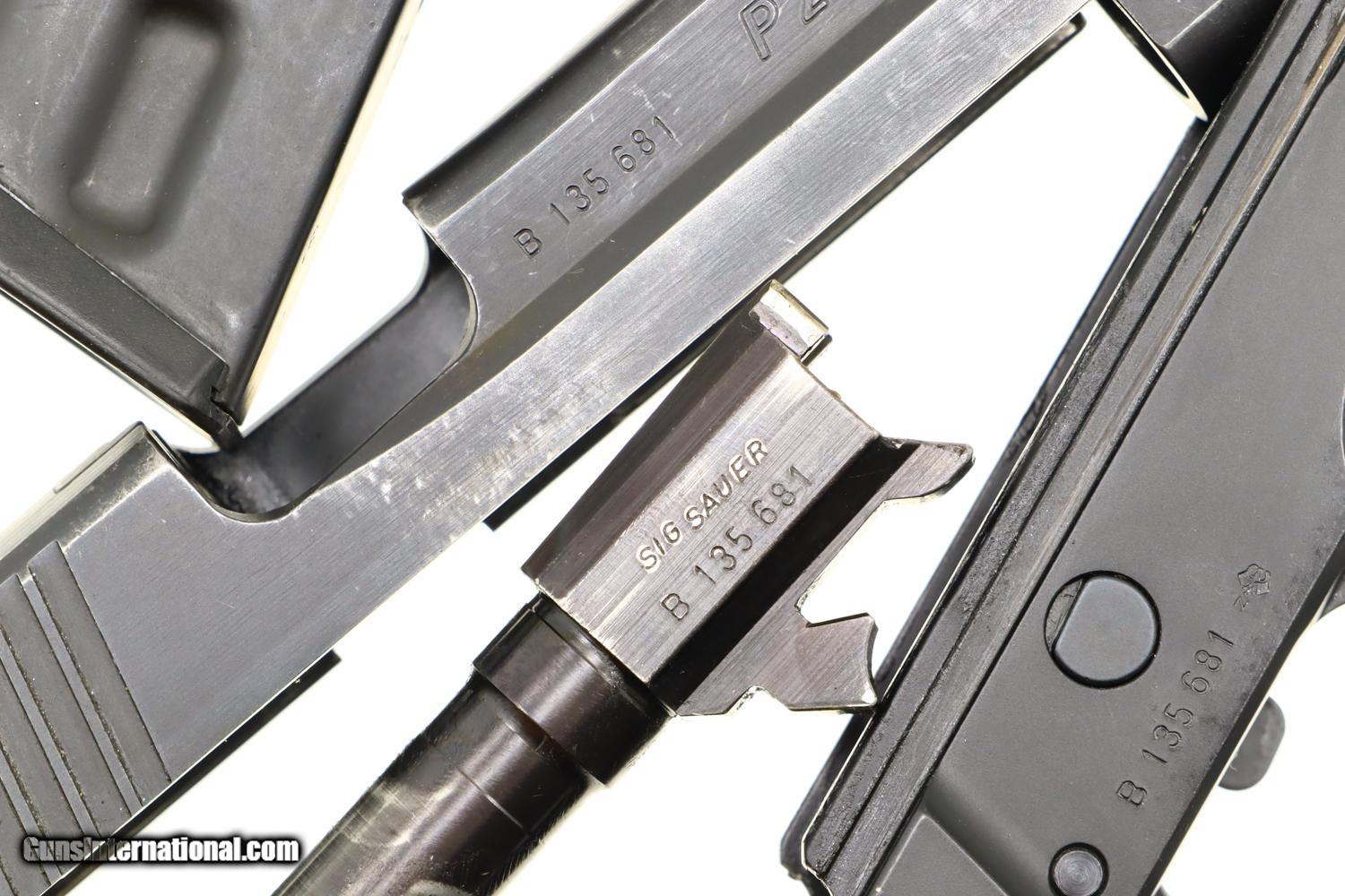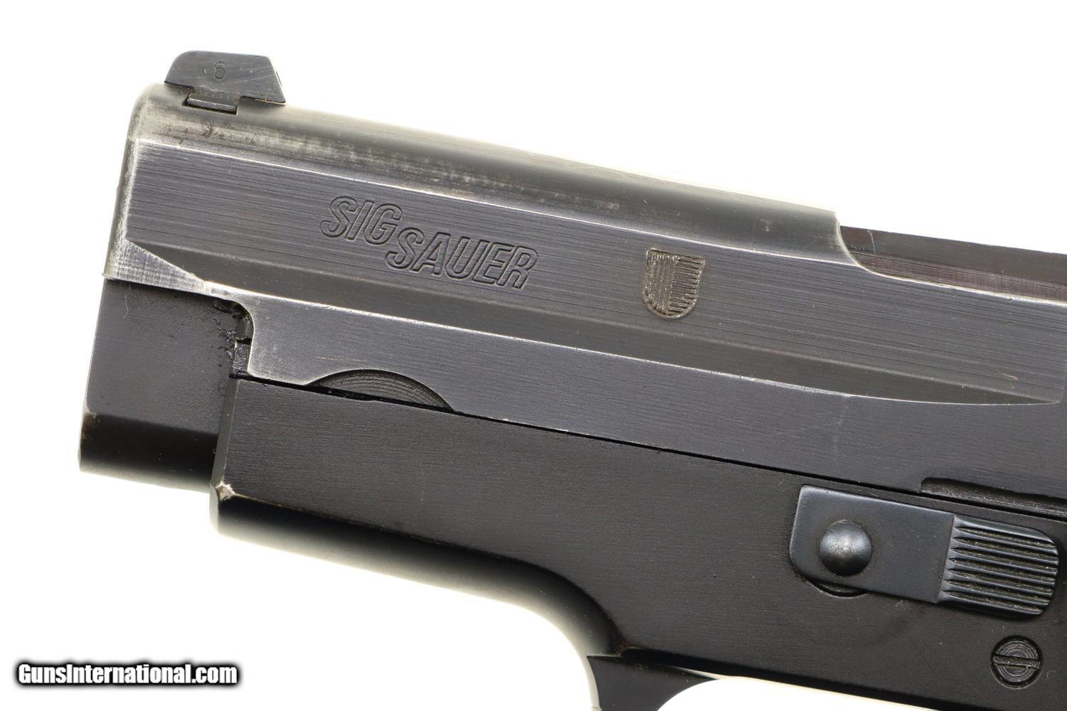 Description: Standard configuration SIG SAUER P228 with drift adjustable night sights. Left side of slide, early variation, marked SIG SAUER followed by the canton symbol of Ticino. The right side of the slide is marked with the model, along with the full serial number that is repeated on the left side of the barrel hood and right side of the frame. Fitted with two piece black plastic grips with a molded frictional surface surrounding the manufacturers name and model. High capacity double column magazine marked SIG SAUER, the zippered spine having indicator holes marked for 5/10/13 cartridges. Synopsis: SIG Sauer, P228, German made for the Swiss Ticino Police, early variation. Condition: VG original finish, with holster wear pattern consistent with moderate service. Comparable condition grips and screws. Magazine with insertional wear as photographed. Mirror bore. Perfect manual mechanics. A SIG Sauer Police variation seldom encountered in the United States. DO NOT PURCHASE IF YOU LIVE IN A STATE WHERE HIGH CAPACITY MAGAZINES ARE RESTRICTED! ~~Insured shipping fee of $45; most packages shipped using FedEx 2nd Day.~~ SOLD Manufacturer: SIG Sauer Serial Number: B135681 Caliber Info: 9mmP |