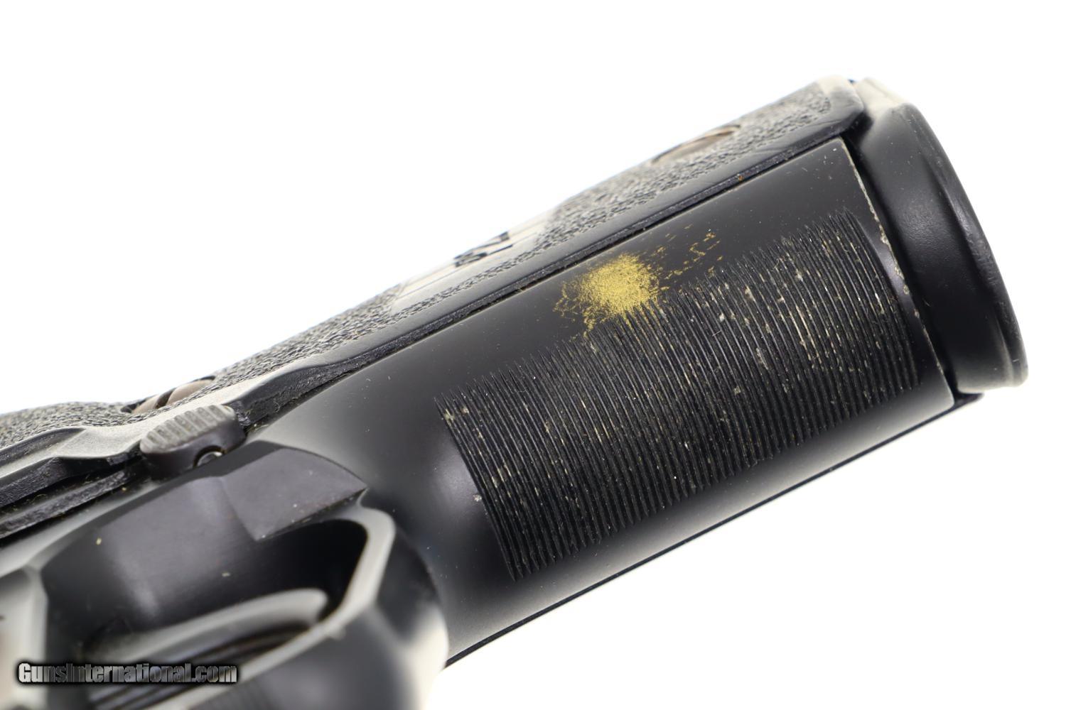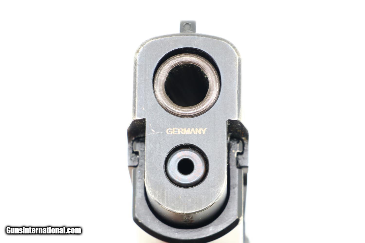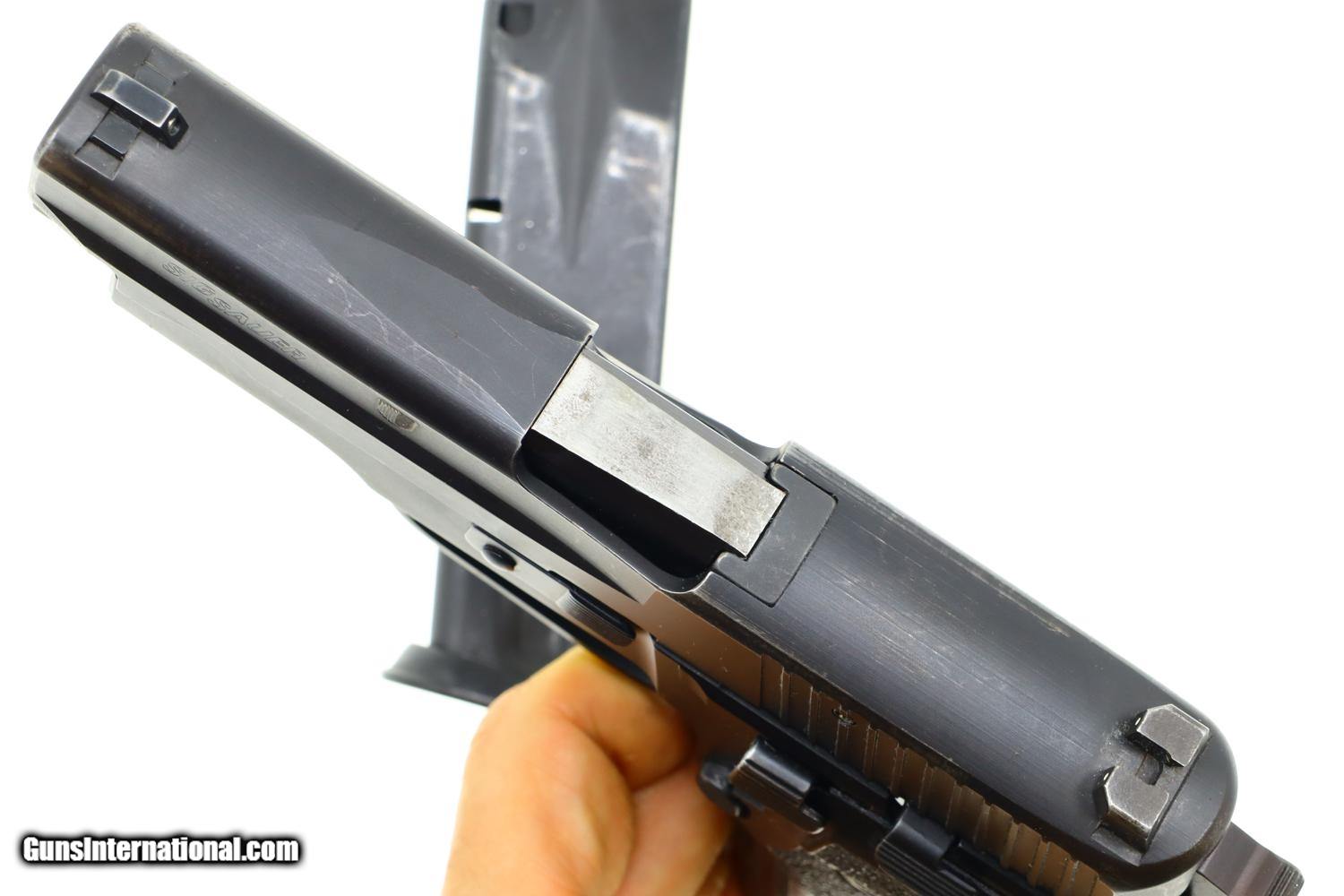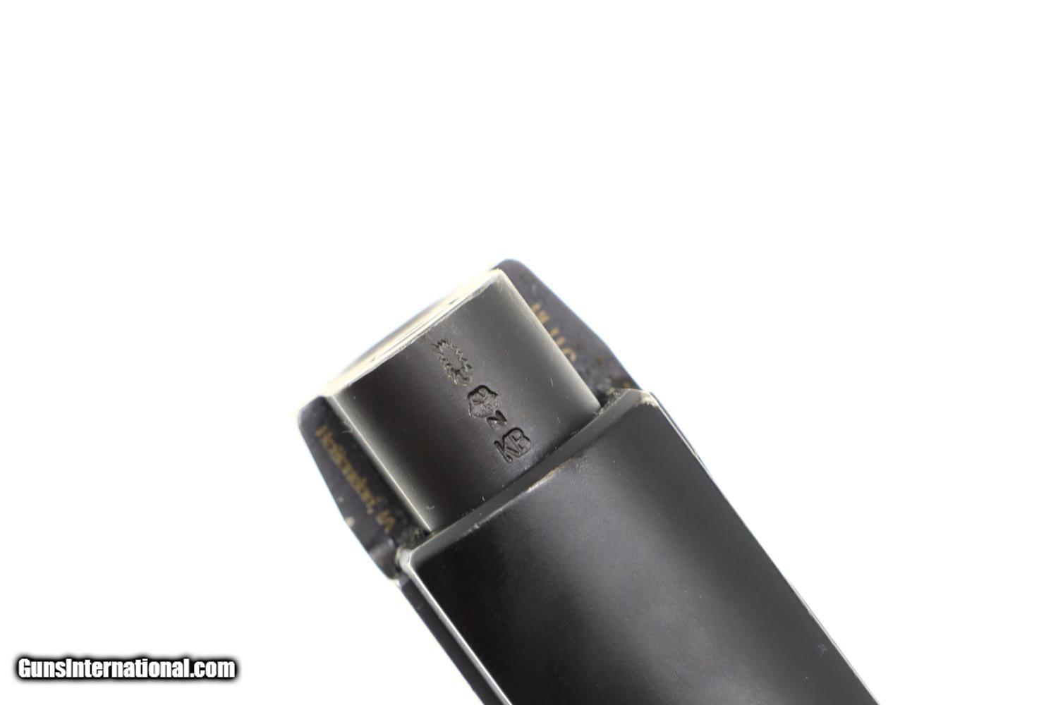 Description: Standard configuration SIG SAUER P228 with drift adjustable night sights. Left side of slide, early variation, marked SIG SAUER followed by the canton symbol of Ticino. The right side of the slide is marked with the model, along with the full serial number that is repeated on the left side of the barrel hood and right side of the frame. Fitted with two piece black plastic grips with a molded frictional surface surrounding the manufacturers name and model. High capacity double column magazine marked SIG SAUER, the zippered spine having indicator holes marked for 5/10/13 cartridges. Synopsis: SIG Sauer, P228, German made for the Swiss Ticino Police, early variation. Condition: VG original finish, with holster wear pattern consistent with moderate service. Comparable condition grips and screws. Magazine with insertional wear as photographed. Mirror bore. Perfect manual mechanics. A SIG Sauer Police variation seldom encountered in the United States. DO NOT PURCHASE IF YOU LIVE IN A STATE WHERE HIGH CAPACITY MAGAZINES ARE RESTRICTED! ~~Insured shipping fee of $45; most packages shipped using FedEx 2nd Day.~~ SOLD Manufacturer: SIG Sauer Serial Number: B135681 Caliber Info: 9mmP |