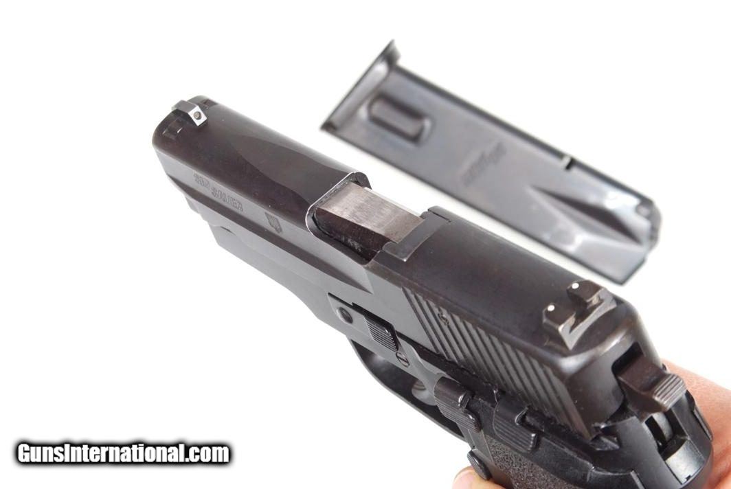 Description: Standard configuration SIG SAUER P228 with drift adjustable night sights. Left side of slide marked SIG SAUER followed by the canton symbol of Ticino. The right side of the slide is marked with the model, along with the full serial number that is repeated on the left side of the barrel hood and right side of the frame. Fitted with two piece black plastic grips with a molded frictional surface surrounding the manufacturers name and model. High capacity double column magazine marked SIG SAUER, the zippered spine having indicator holes marked for 5/10/13 cartridges. Synopsis: SIG Sauer, P228, Swiss Ticino Police. Condition: VG+ original finish, with holster wear pattern consistent with light service use. Comparable condition grips, usual burring of screw slots. Magazine with insertional wear as photographed. Mirror bore. Perfect manual mechanics. A SIG Sauer Police variation seldom encountered in the United States. DO NOT PURCHASE IF YOU LIVE IN A STATE WHERE HIGH CAPACITY MAGAZINES ARE RESTRICTED! ~~Insured shipping fee of $55; most packages shipped using FedEx 2nd Day.~~ SOLD Manufacturer: SIG Sauer Serial Number: B197850 Caliber Info: 9mmP |