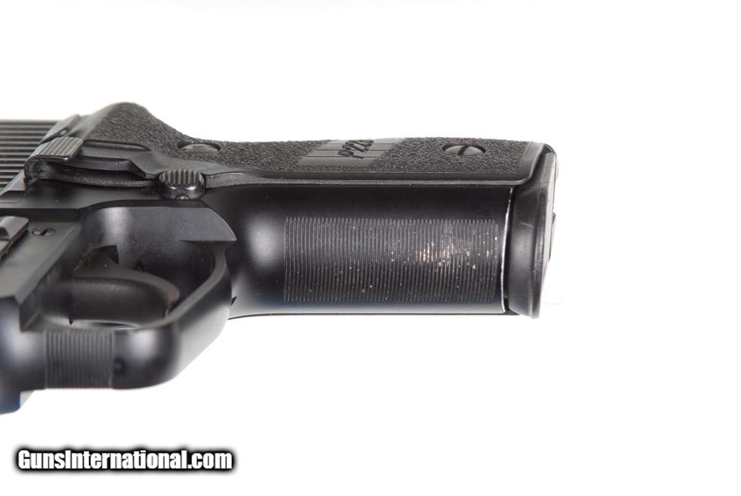 Description: Standard configuration SIG SAUER P228 with drift adjustable night sights. Left side of slide marked SIG SAUER. The right side of the slide is marked with the model followed by the police notation “ti/Ticino canton shield”. The full serial number is repeated on the right side of the slide, the left side of the barrel hood, and right side of the frame. Fitted with two piece black plastic grips with a molded frictional surface surrounding the manufacturers name and model. High capacity double column magazine marked SIG SAUER, the zippered spine having indicator holes marked for 5/10/13 cartridges. Synopsis: SIG Sauer, P228, Swiss Ticino Police, B315631, I-804 Condition: EXC original finish, with holster wear pattern consistent with light service use. Comparable condition grips. Magazine with insertional wear as photographed. Mirror bore. Perfect manual mechanics. A SIG Sauer Police variation seldom encountered in the United States, this example in unusually high condition. DO NOT PURCHASE IF YOU LIVE IN A STATE WHERE HIGH CAPACITY MAGAZINES ARE RESTRICTED! ~~Insured shipping fee of $55; most packages shipped using FedEx 2nd Day.~~ SOLD Manufacturer: SIG Sauer Serial Number: B315631 Caliber Info: 9mmP |