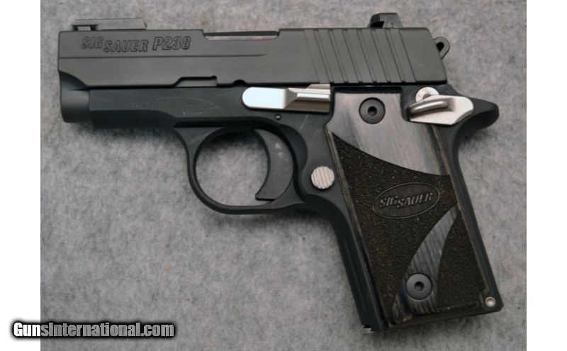 Description: Excellent overall condition P238 with factory case, holster, and 1 magazine. SOLD Caliber Info: .380 Auto Metal Condition: Excellent with a few scratches on left side of frame, minor finish wear on receiver Wood Condition: Excellent with very minor handling wear Bore Condition: Excellent Barrels: 2 3/4 Triggers: Single action Stock: Blackwood grips Sights: Front fixed Tru Glo green fiber optic, rear fixed Siglite night sight Item Location: Christiana, DE |