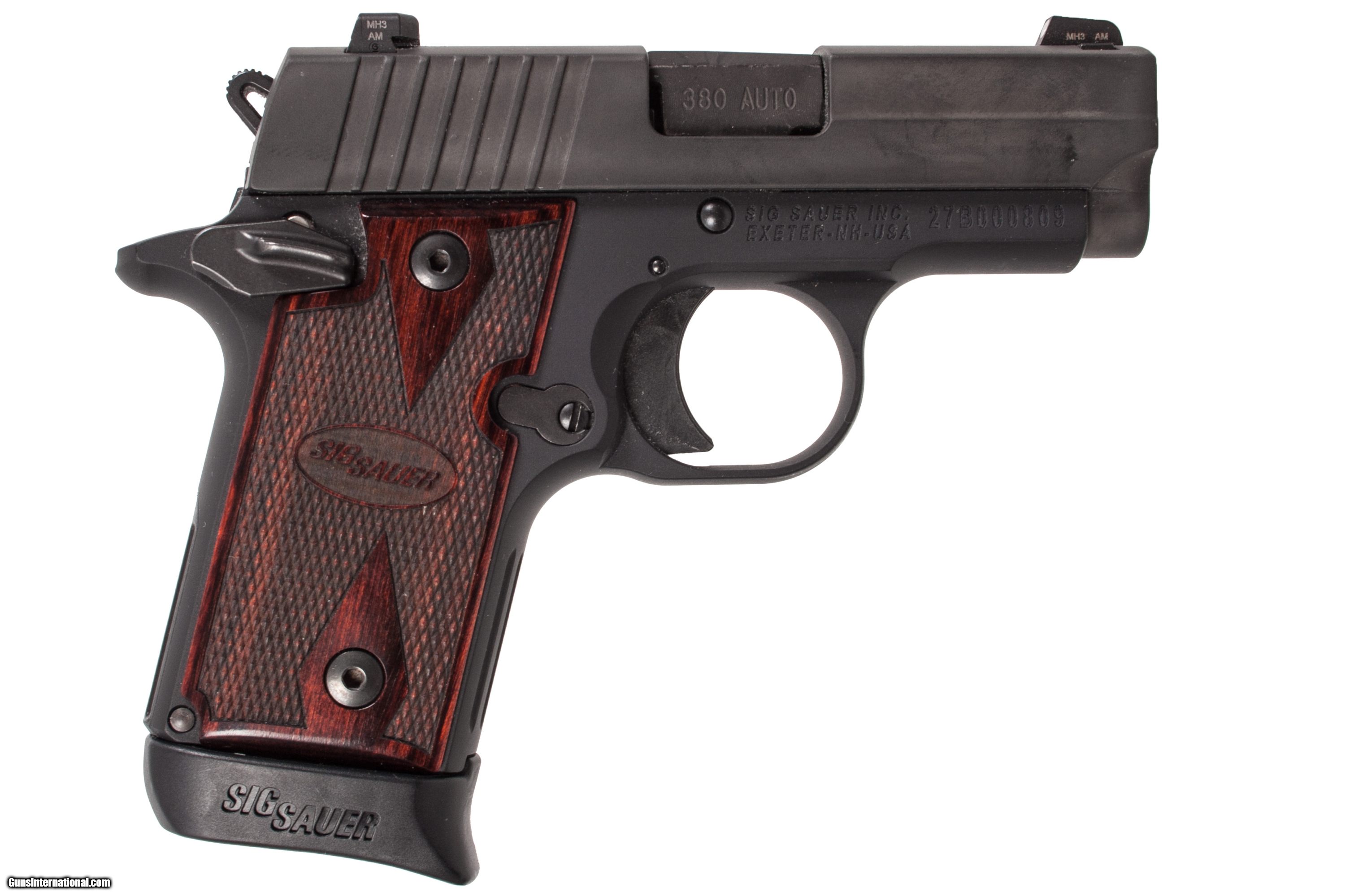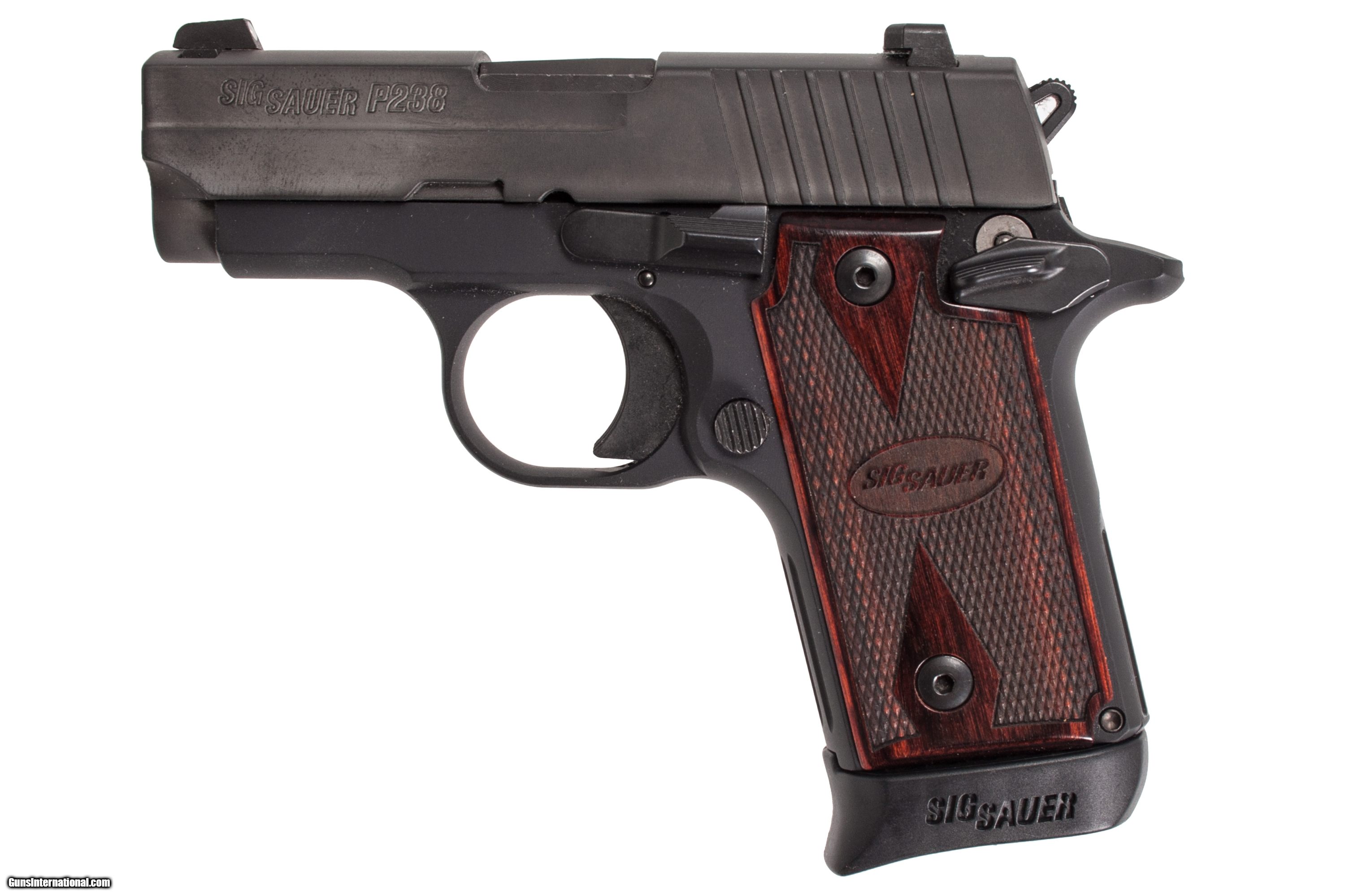Description: Sig Sauer P238 Rosewood chambered in 380 acp with a 3 inch barrel case and 1 extra magazine. This gun is in excellent condition and is covered by Dury's Lifetime Warranty.