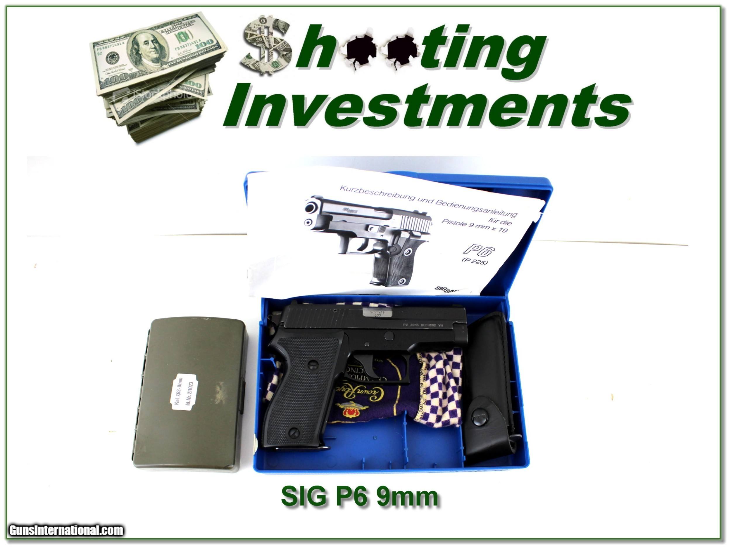 Description: This is a lightly used German Sig Sauer P6 9mm. It come as seen in case with manual. It includes a second magazine in leather belt holder. Also include in a period bore cleaner. It will make a nice addition to your collection. I am selling this one on consignment and as such lay-a-way can’t be used. It does of course have the standard 3-day inspection. Shipping and insurance is $39. Please email me with any questions or larger pictures. (Consign your quality firearms with Shooting Investments for only 12%! Let me know if you have any you would like to sell!) 23-0052 Payment: Payment is by Money Order, Cashiers Check or Personal Check. I can now also accept Credit Cards (MasterCard, Visa, Discover & American Express) with a 3% convenience fee. Shipping: The shipping charge will be listed in each description. It is $49 for most long guns. Some heavy guns, over 48in boxes or those insured for over $2000 will be higher. Shipments to Alaska and Hawaii are higher because air shipment is required. Most firearms are shipped on Tuesday and Thursday and usually in 5 days of receipt of payment. We package all shipments carefully and insure them. Optics are shipped Priority Mail and most other non-firearm shipments are shipped First Class. Returns: Our return policy is simple. If for any reason you are not pleased with your purchase, you may return your item for a full refund of purchase price. Ammunition cannot be returned. It is important to us that you are happy. Guns cannot be fired or dissembled before returning them and they must be returned in the same condition as received. Notification of a return must occur with-in 3 days of receipt at your dealer. Shipping, convenience and dealer fees are not refundable and are the responsibility of the buyer. Lay-a-way: If needed, we offer a 60 day lay-a-way option on most firearms. It is 1/3 now, 1/3 in 30 days and 1/3 in 60 days. Lay-a-way firearm sales are final and if not completed the first payment cannot be returned. Consigning your firearms with Shooting Investments: We will help you get top dollar for your firearms. While most local guns shops charge 20% or more, our fee is only 12% with a minimum of $75. At your local gun shop it might take months to sell. Selling on-line provides instant access to thousands of interested buyers. You won’t find any other on-line dealer willing to sell your firearms for only 12% or listing every gun on 3 separate s. Selling through an House typically costs the seller 15% and the buyer an addition 15% (so 30%) and you have to wait several months to sell and longer to receive funds. If properly priced, we will sell your firearms in a few weeks. Send us an email or give us a call and we’ll explain how easy it is for you to get top dollar. Trading: Trading for use is really just buying your gun to re-sell. If you have a gun you want to trade, please email a picture and we will let you know what we can give or it. You will always get more if we sell it for you on consignment. Help for California Buyers: We are happy to ship to California. It is the buyer’s responsibility to make sure any item you buy is legal in your state. We are also happy to help with your purchase of a firearm from someone other than us. If you see a gun you would like to buy but the seller can’t or won’t ship to California they can ship to use and we’ll then ship it to your California dealer. The cost for this service is only $30 + shipping. Let us know if we can help! SOLD |