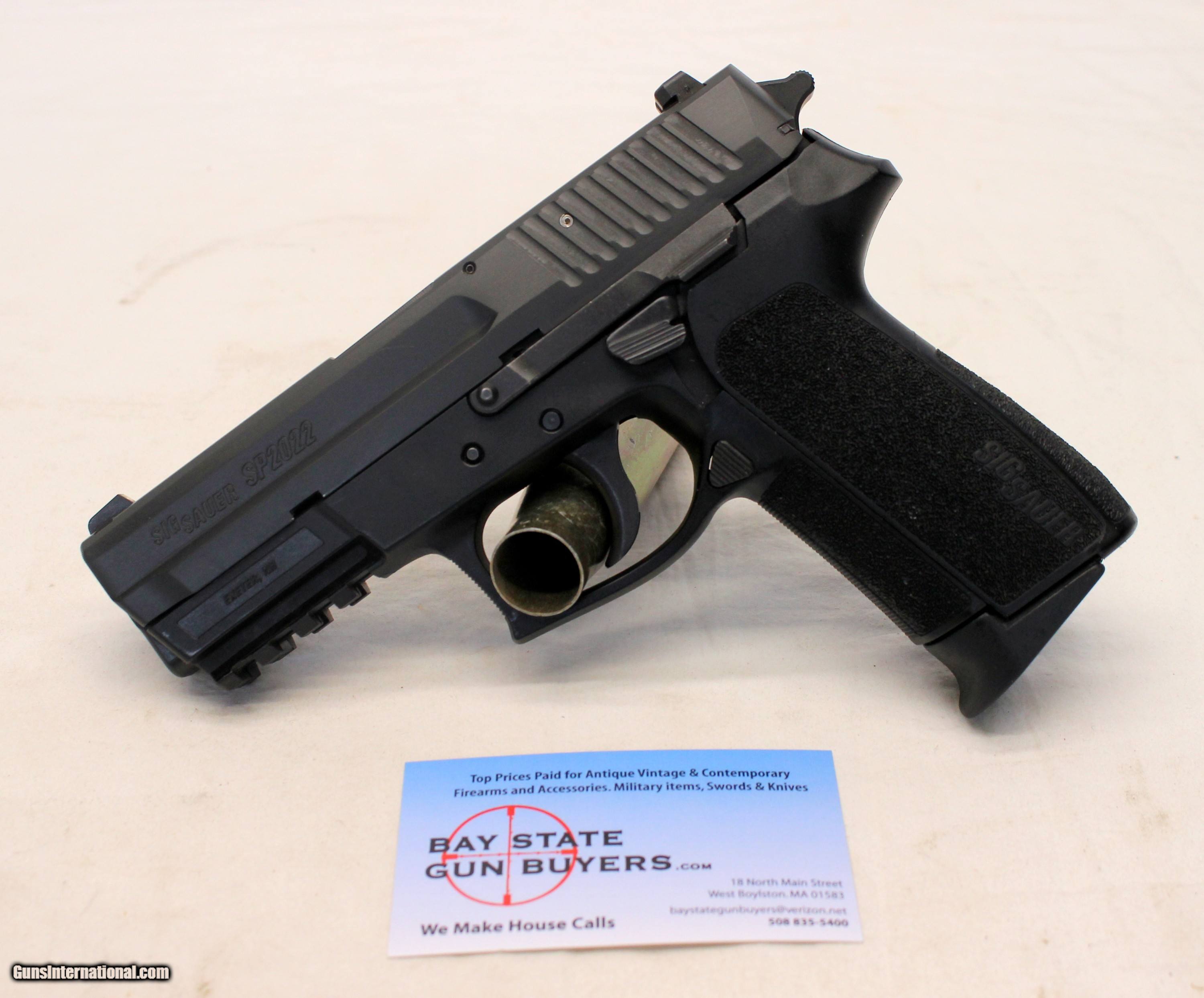Description: We are offering for sale a Sig Sauer SP2022 semi-automatic pistol chambered in 9mm caliber. This preowned gun remains in very good, fully functioning condition with scattered handling wear. 3.75" barrel is very good with clean bore showing good rifling. The slide is very good with very light wear. Polymer frame shows scattered handling marks. Gun functions flawlessly. Grips show light signs of wear from use. 10rd factory magazine included. SHIPPING IS $19.95 USPS PRIORITY WITH INSURANCE **** PLEASE NOTE: WE ONLY ACCEPT MASTERCARD AND VISA AS PAYMENT OPTIONS (please note we charge a non-negotiable 3% CC fee) **** **** WE TAKE CREDIT CARD PAYMENT OVER THE PHONE. WE DO NOT TAKE PAYMENT THROUGH THIS **** PLEASE LOOK AT ALL PHOTOGRAPHS FOR CONDITION Please know the legality of any weapon in your state before . If a gun can’t be transferred to you we will charge a 15% re-stocking fee. We are in the shop MODAY, WEDNESDAY, THURSDAY, FRIDAY and SATURDAY 8am-4pm EST. We will be in touch within 24 hours of your purchase. Please be ready to provide CC information. Please have your FFL email a copy of their license to: . No Face To Face Transfers! Please note: Clicking "buy" does not guarantee that this gun is yours, However clicking “Buy” will reserve this gun for you, if it hasn’t been sold in store. We will try to do our best to remove the posts as efficiently as possible, but sometimes delays may ensue. “Buy” is your safest bet to reserve a gun. Also please add 6.25% MA state sales tax (if from MA) and 3% credit card shop courtesy fee for all out of state buyers Before calling with concerns read these conditions and meet them accordingly. SOLD |