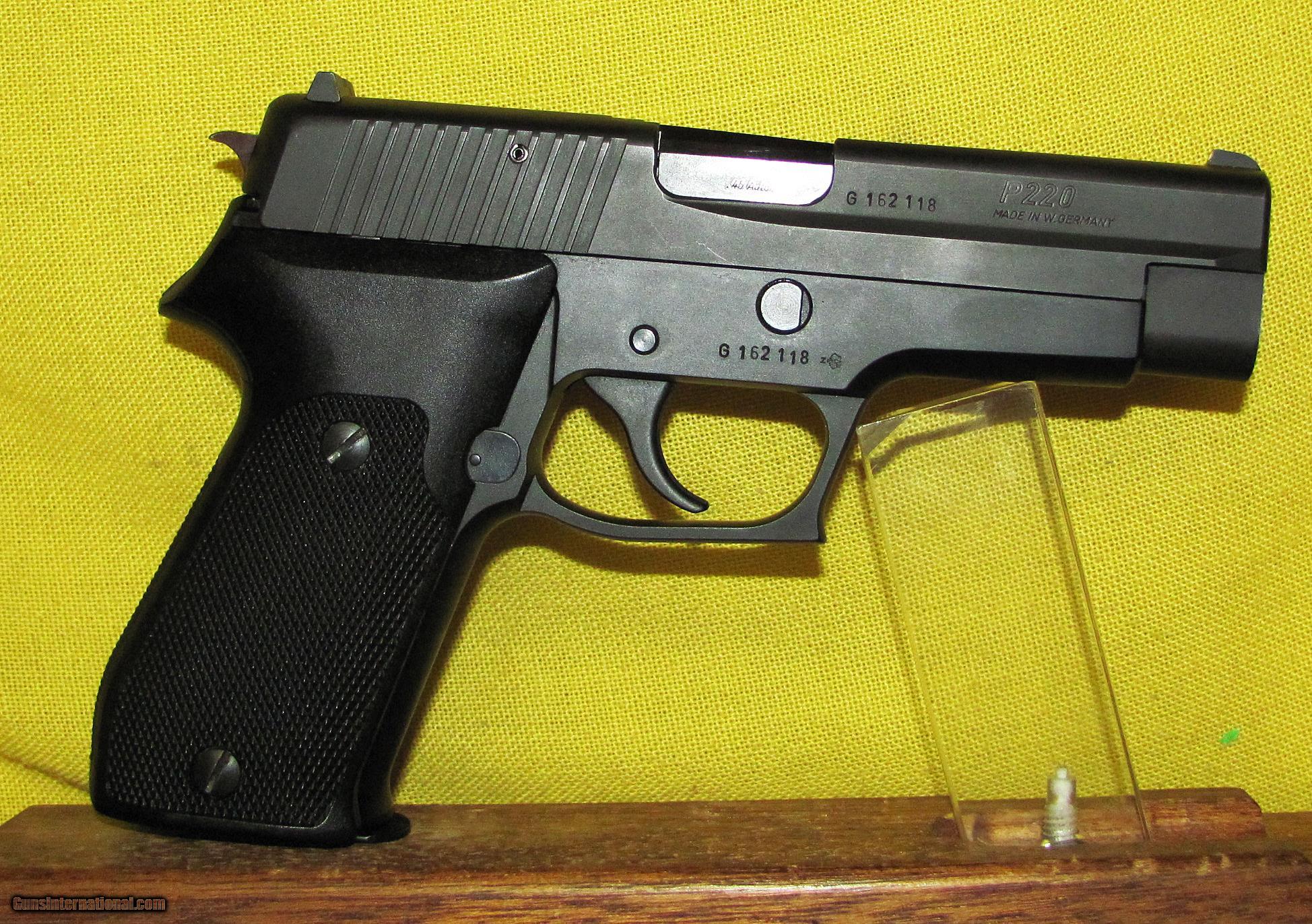 Description: SIGSAUER P220 IN .45 ACP CAL., WITH 4 1/2" BARREL. COLOR MATTE. CONDITION 98%. SERIAL NUMBER C162118. SIGSAUER MODEL P220, BORE AND GRIPS ARE BOTH IN EXCELLENT CONDITION, 98% FACTORY FINISH, RED LINED FACTORY BOX, TWO FACTORY MAGAZINES, OUR NEW STOCK # . SOLD |