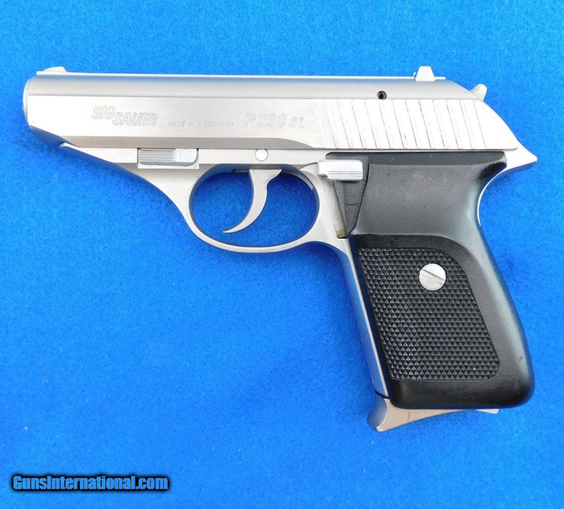 Description: SigSauer P230 SL .380, 3" bbl, bright shiny bore, good rifling, stainless steel finish, square notch rear sight with painted red dot, painted red dot front sight, de-cocker, black checkered grips, and one 6 round magazine. Very nice pistol! Add 3% for Credit Card Shipping $25.00 SOLD |