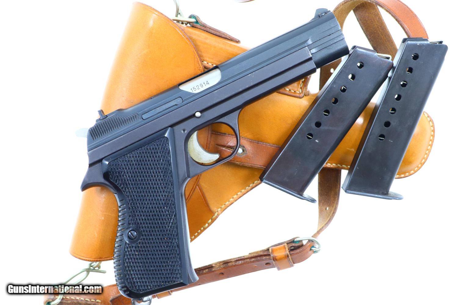 Description: Description: Standard configuration SIG P49 late military pistol, single action, in 9mmP, with 4.75" barrel and drift adjustable front and rear sight. The left side of the slide and frame are proofed and marked with the full serial number that is repeated on the right side of the barrel hood. Safety detentes are marked with an "S" in white and "F" in red. "P" release marked on the front of the trigger guard and discreetly applied import marking on base of frame where covered by the magazine floorplate. Disassembly shows a matching hammer group with the usual half cock. Fitted with checkered black plastic grips, integral escutcheons, secured with a single transverse screw. Fixed lanyard ring. Complete with two correct matte finish magazines. Original holster manufacturer marked and dated "63” on obverse surface, with military strap dated “64”. Synopsis: Phenomenal, original, Swiss military SIG P49, all matching, matte finish rig. Nearly impossible to upgrade! Condition: 99+% original finish with only minimal wear. Comparable condition grips and correct matte finish magazines. Bright bore with sharp rifling. Perfect manual mechanics. Holster and strap in same impeccable quality. An extraordinary rig that would be virtually impossible to improve upon! SOLD Manufacturer: SIG Serial Number: A152914 Caliber Info: 9mmP |