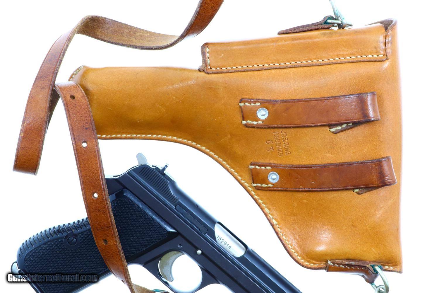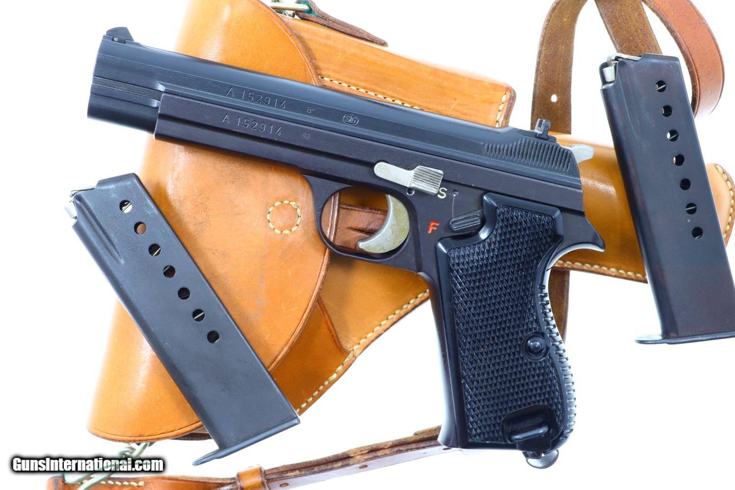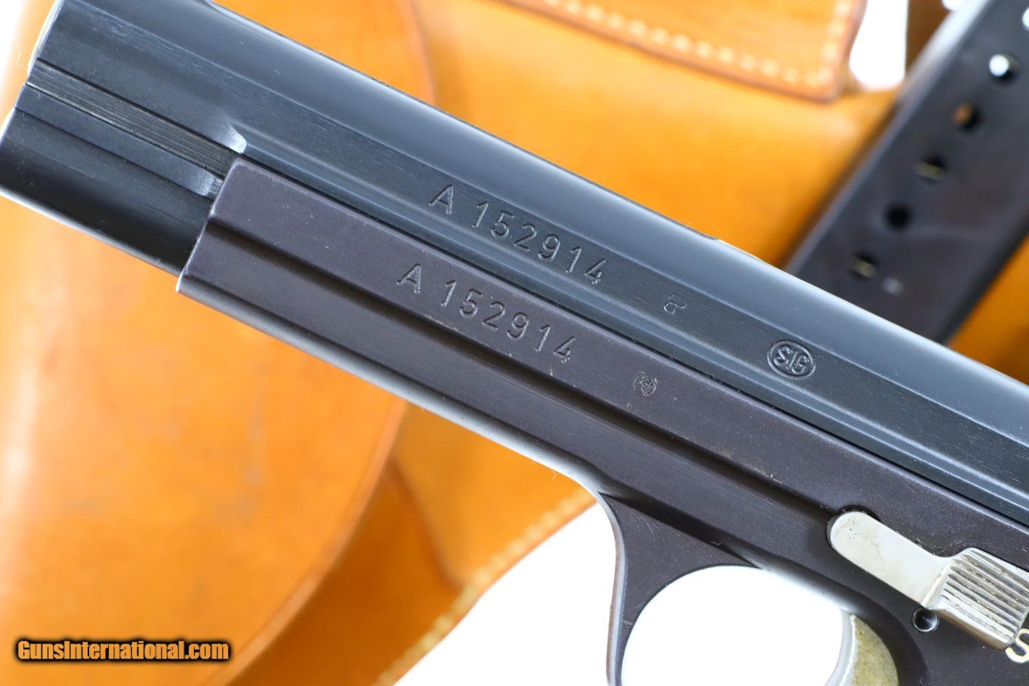 Standard configuration SIG P49 late military pistol, single action, in 9mmP, with 4.75" barrel and drift adjustable front and rear sight. The left side of the slide and frame are proofed and marked with the full serial number that is repeated on the right side of the barrel hood. Safety detentes are marked with an "S" in white and "F" in red. "P" release marked on the front of the trigger guard and discreetly applied import marking on base of frame where covered by the magazine floorplate. Disassembly shows a matching hammer group with the usual half cock. Fitted with checkered black plastic grips, integral escutcheons, secured with a single transverse screw. Fixed lanyard ring. Complete with two correct matte finish magazines. Original holster manufacturer marked and dated "63” on obverse surface, with military strap dated “64”.