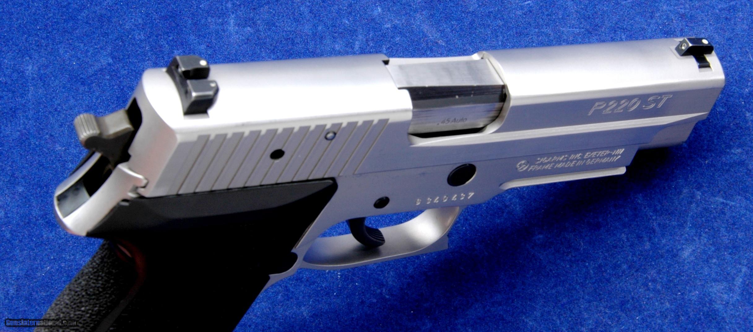 Description: Available for purchase is a very nice used Sig 220 ST. This is the 220 model that is all stainless steel, top and bottom. Chambered of course in .45acp. Excellent overall condition, some high edge wear to the steel, the bore is mint. grips are also excellent. Approx 1000 rounds thru this pistol. No factory box or manual, but comes with an excellent right hand Galco OWB holster w/retention, might be a Fletch, russet in color. 4 magazines and a black Galco twin mag belt pouch. That's prob a solid $200 in extras. At $799.95, this gun and all of the accessories is underpriced. $35 shipping to the lower 48 and 3% surcharge for CC. SOLD |
