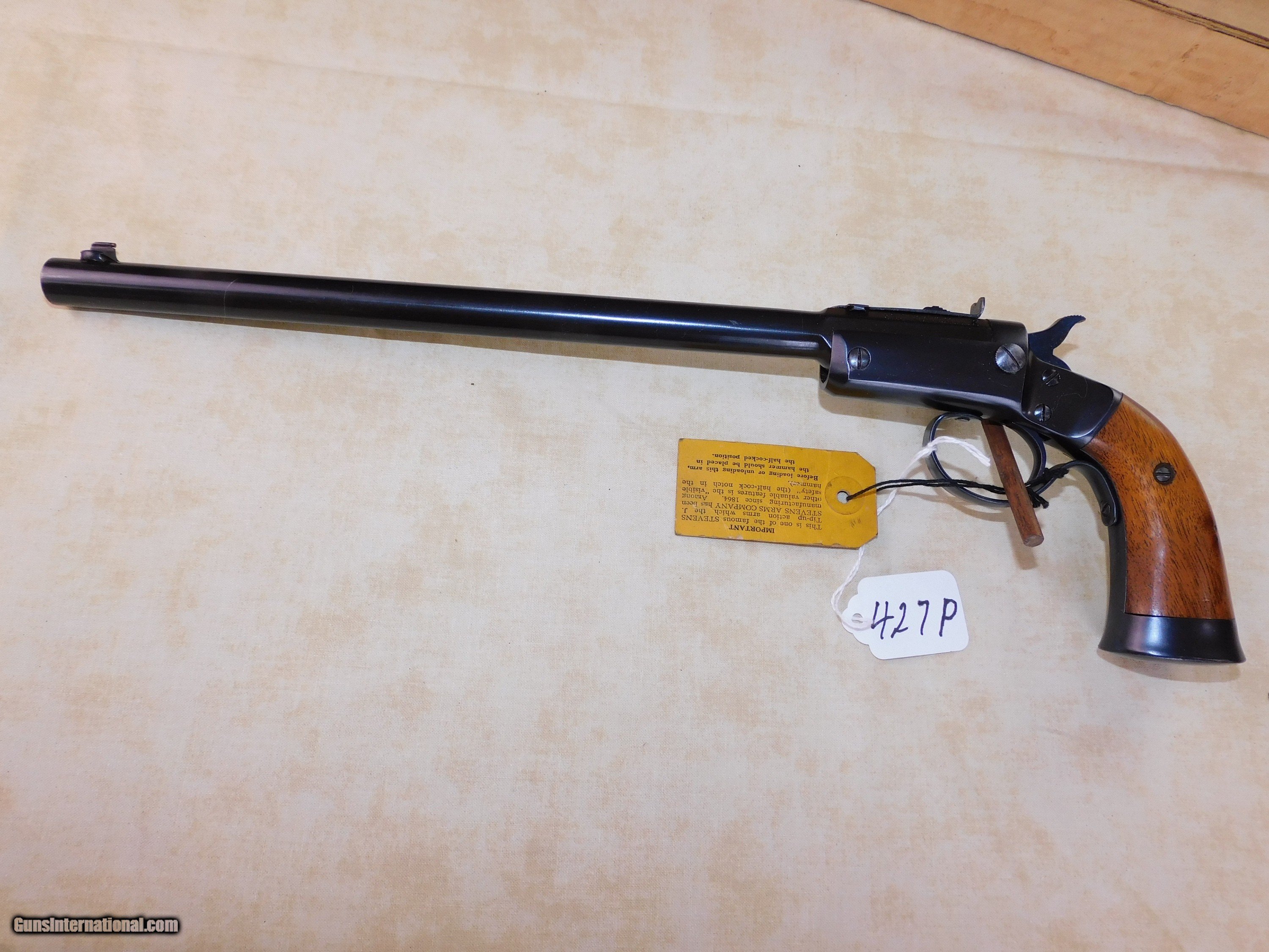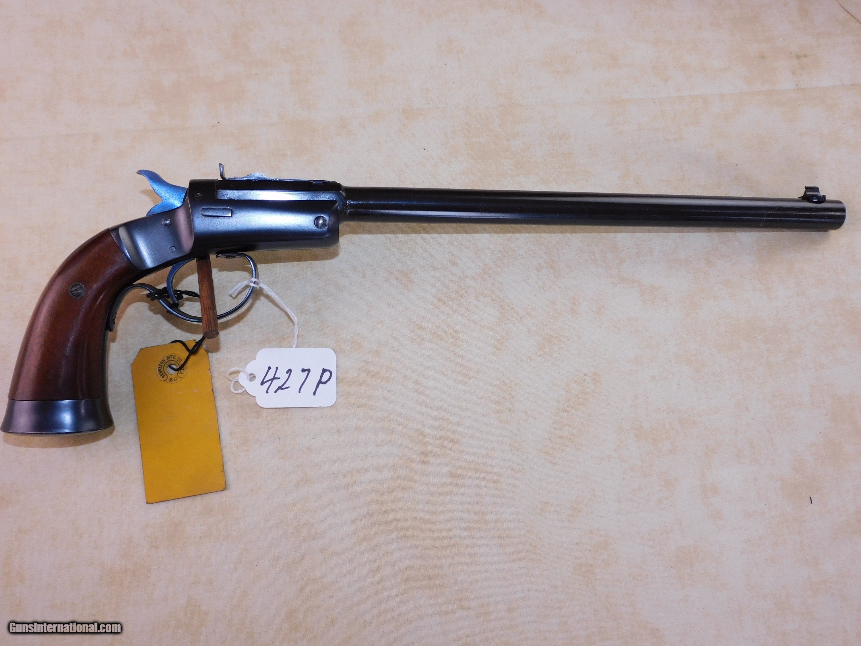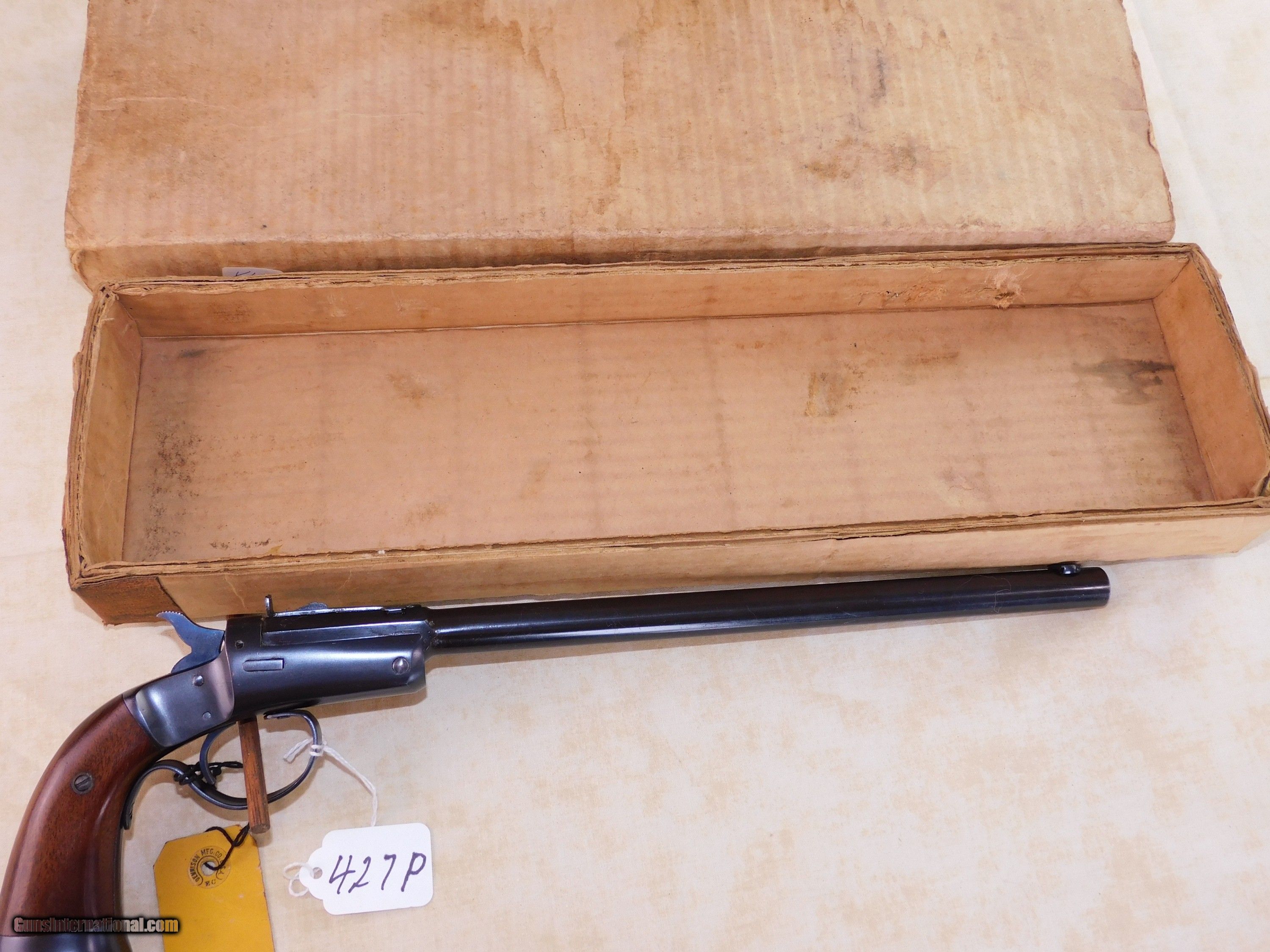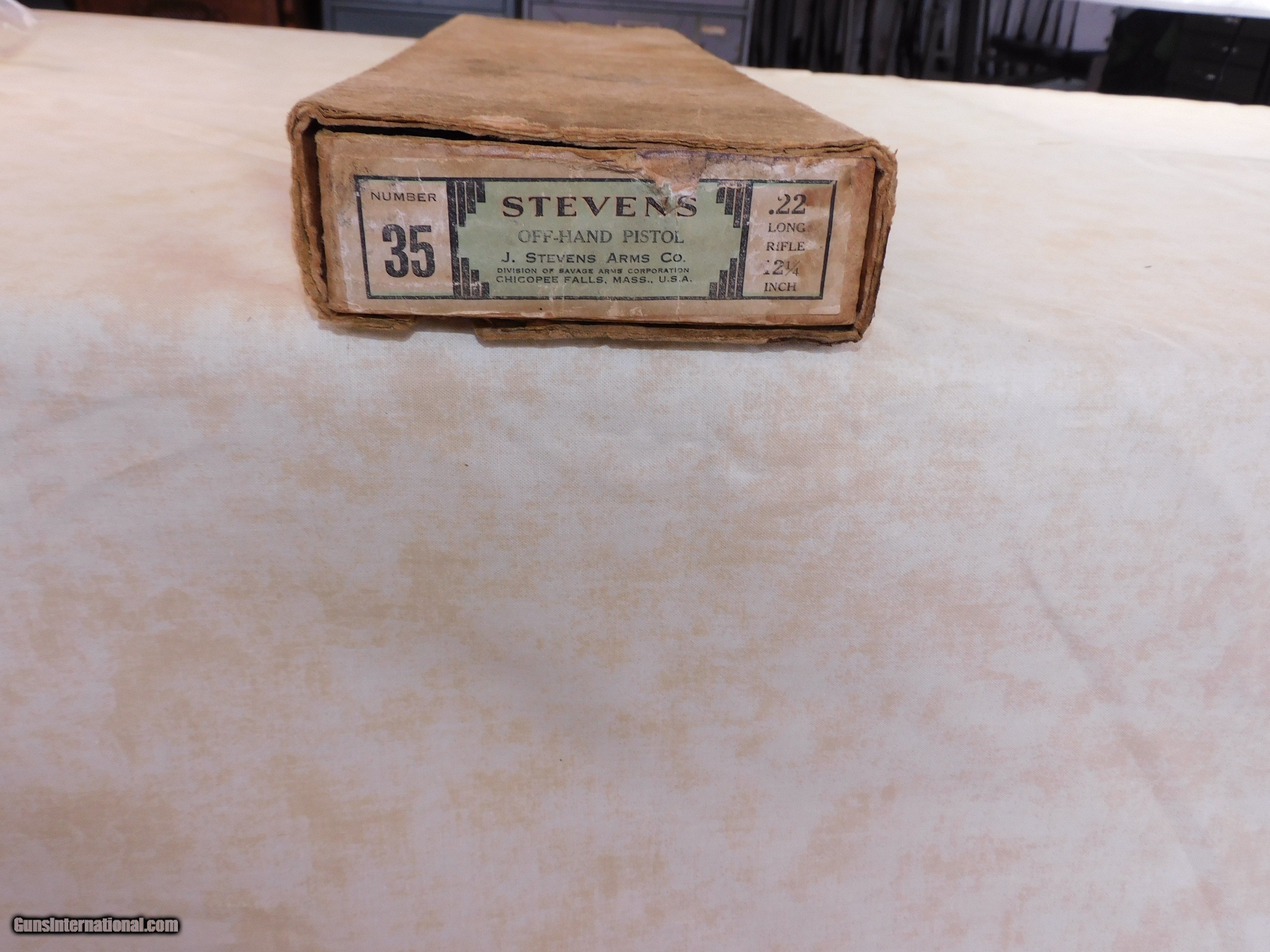Description: #427P STEVENS OFF HAND MODEL 35 PISTOL, 22 RF, SN 13XX, 12 1/4” bbl., mint in the original box, some slight box wear, hanging tags & Stevens label, very rare with 12” bbl. & original box. $2500 FFl required Curio/Relic: Yes Price: $2,500.00 Contact Seller |