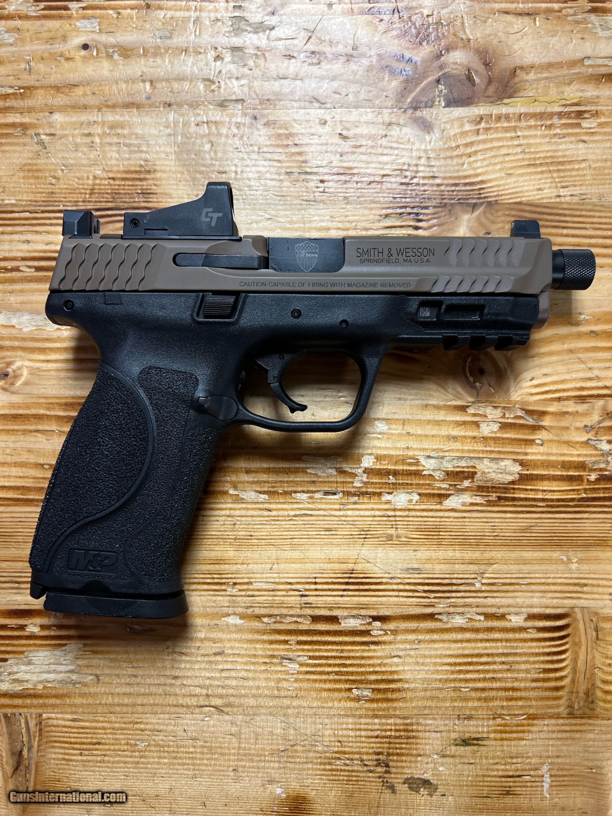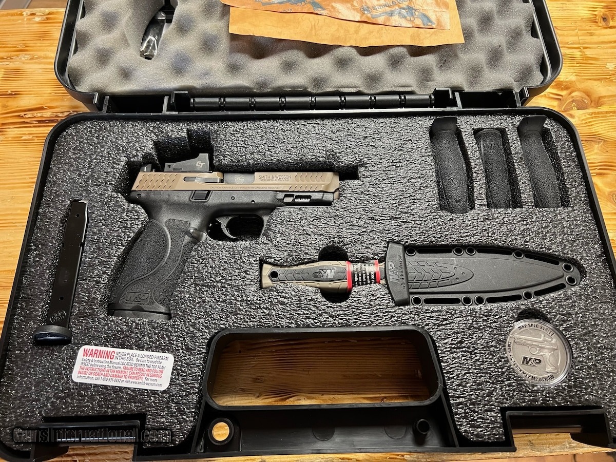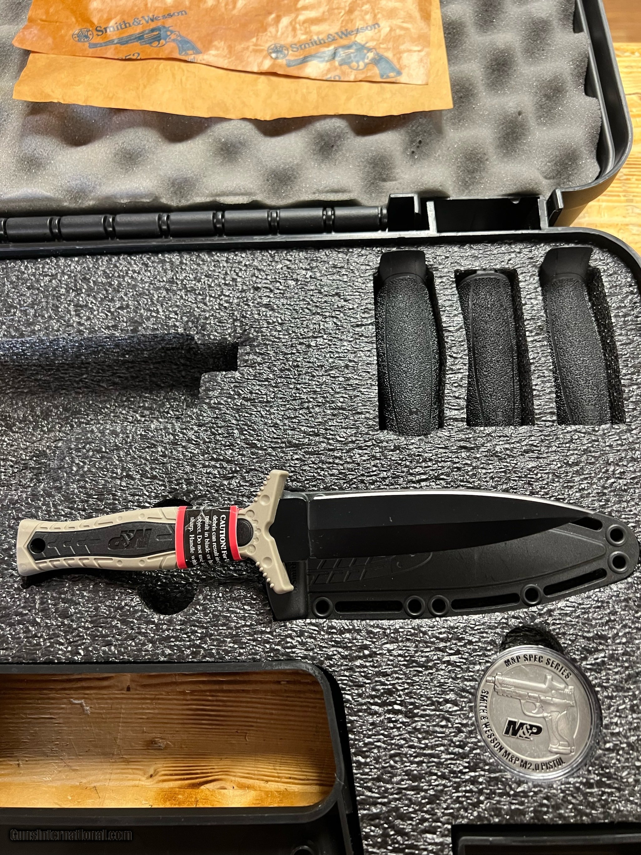 Description: Guns Listing ID: 763763 This firearm is in excellent shape and appears to have been fired very little if any. Finish is virtually untouched. Includes the factory hard case, two 17 round magazines, three backstrap adjustment pieces, Smith & Wesson dagger with sheath, MP Spec Series challenge coin, as well as the factory cable lock and paperwork. Pistol itself features a Crimson Trace 5 MOA red dot sight, threaded barrel, as well as suppressor height sights. SOLD Manufacturer: SMITH & WESSON Model: MP M2.0 Spec Series Caliber Info: 9MM LUGER (9X19 PARA) Condition: Used - Non-Certified Barrels: 4.75 BARREL Finish: FDE/BLACK |