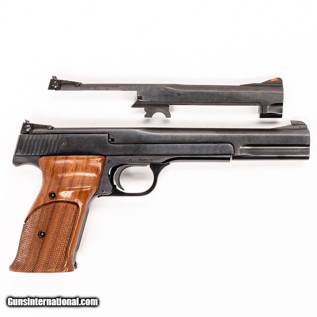 Description: Guns Listing ID: 401107 A semi-auto handgun chambered in 22 LR, the Smith & Wesson Model 41 is made with a switch-barrel design that allows either a 5.5\" or 7\" barrel to be used on the same frame. The Model 41 was designed shortly after World War II and made for competitive target shooting. This Model 41 comes with the original box, manual, and four 10-round magazines. It has a 7\" barrel and comes with a 5.1\" plinker barrel. Serial number: A656859 SOLD Manufacturer: SMITH & WESSON Model: MODEL 41 Caliber Info: .22 LR Condition: Used - Certified Barrels: 7 BARREL Finish: BLACK |