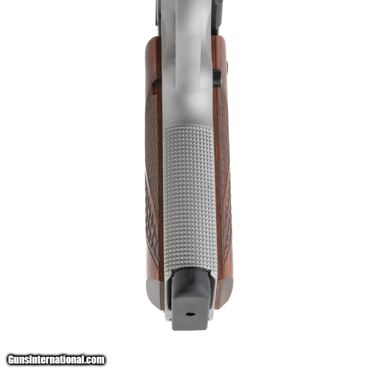 Single action stainless pistol with a scalloped slide front and back, laminate E-series grips, and a grips safety & manual safety. Two Magazines. NEW. UPC:022188084825.