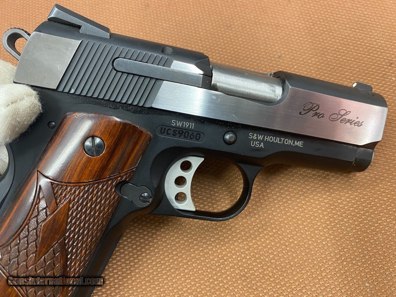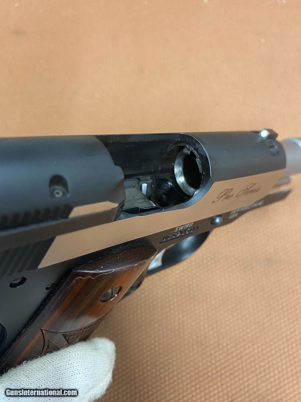 Description: Beautiful S&W SW1911 Pro Series Two Tone 45 auto, 3" barrel and 2 magazines! The guns in in great shape, and it's a smooth shooter. We have test shot this pistol and it shoots fantastically! Not snappy or snatch at all! Very well balanced gun! The grips are in excellent condition and they sure stand out! It comes with two factory magazine, one with larger capacity! The bore and chamber are superb! No box! Priced to sell! Don't miss out on it! Cashier checks & money orders same as cash. Personal checks will be held until funds clear (3-5 business days). Shipping insured will be $55 to Continental US only (AK & HI extra). No sales to California! SOLD Handgun Caliber: .45 ACP (.45 Auto) |