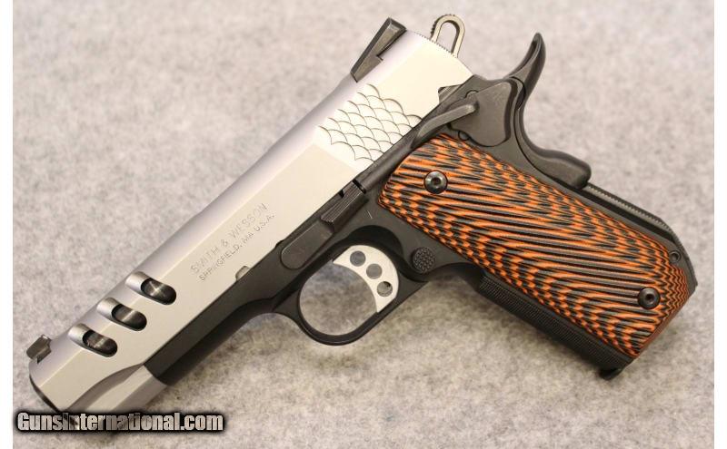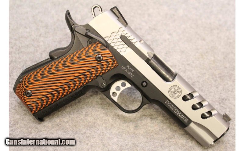 Description: This S&W PC1911 chambered in .45 Auto features, two-tone finish, alloy frame, slide cuts, 3-dot white sights, ambidextrous manual thumb safety, checkered main spring housing/front strap, and black/orange synthetic grips. .45 Auto SOLD Metal Condition: Great Wood Condition: Great Bore Condition: Bright Barrels: 4 Weight: 1.7 lbs. Item Location: Hoffman Estates, IL |