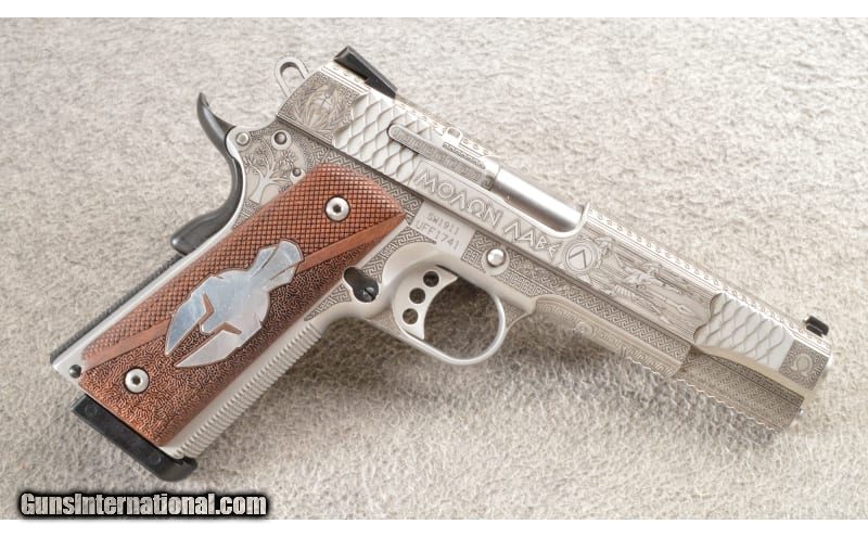 Description: S&W Smith & Wesson 1911 E Series chambered in 45 ACP with a 5" barrel. This is a DF Arms fully laser engraved pistol with a unique Molon Labe theme and custom wood grips. The phrase "molon labe" is in the Classical Greek of Plutarch, reflect the Doric dialect that Leonidas would have used. The phrase is participial, and the translation would be "when you come, take it! This pistol is in excellent lightly used condition. Comes with the factory hard case, owner manual, safety lock, DF Arms coin, bushing wrench and the original factory wood grips. .45 Auto SOLD Chambers: 7+1 Semi auto. Metal Condition: Excellent. Wood Condition: Excellent. Bore Condition: Bright and sharp. Triggers: Single action trigger. Weight: 2.25 lbs Sights: 3 dot. Item Location: Owatonna, MN |