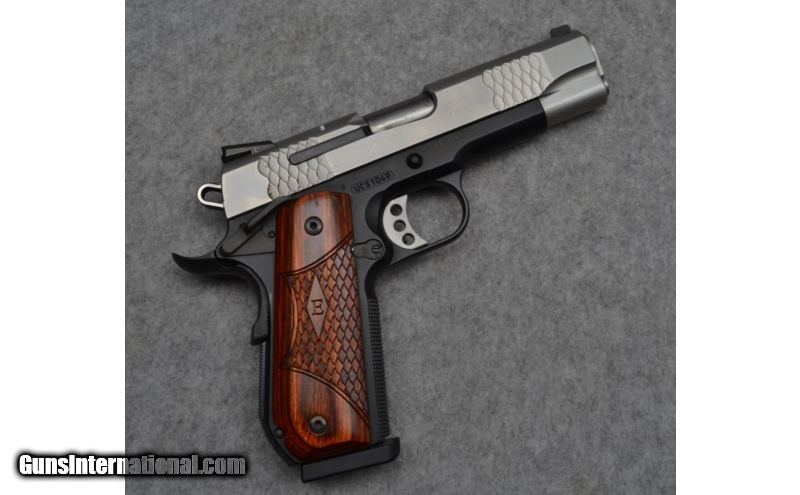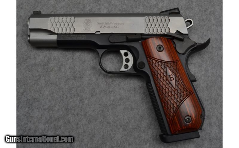 Description: A gently used Smith & Wesson 1911 SC semi auto pistol in .45 ACP. This pistol features a 4 inch barrel with a round butt blued frame and stainless slide. The overall appearance is nice with the factory scallops on the slide and nice checkering on the walnut grips. It comes with the factory box. SOLD Caliber Info: .45 ACP Chambers: Semi auto. Metal Condition: Good with light handling marks. Wood Condition: Good walnut grips. Bore Condition: Shiny and bright. Barrels: 4" barrel Triggers: Single stainless trigger. Stock: Smith laminated wood grips Weight: 36 Ozs. Sights: Factory night sights. Extras: box Item Location: Woodbury, MN |