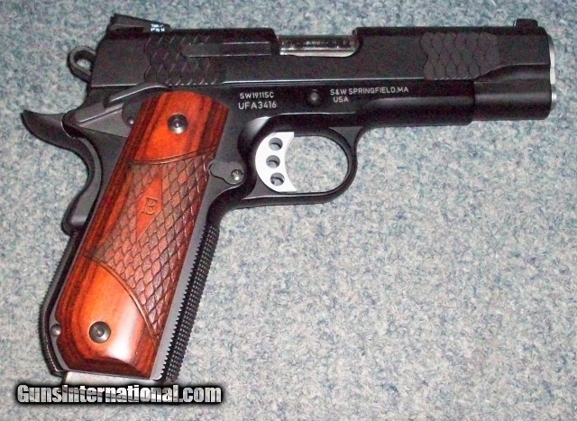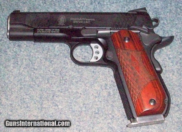 Description: This .45ACP pistol is a Smith & Wesson model 1911SC, E-Series Semi Auto with a 4.25" barrel. Scandium Alloy Frame with black finish. Tritium NIGHT SIGHTS. Wooden Liminate E-Series grips. Thumb & grip safetys. TWO 8 Rd. Mags. LOOKS NEW (Appe SOLD |