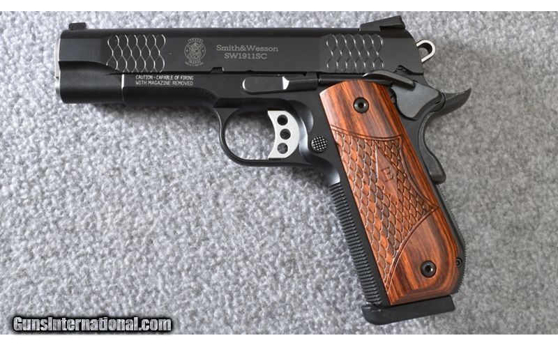 Description: This Smith & Wesson SW1911SC is in excellent condition showing light use. Slide features fishscale slide cuts in front and rear. Complete with plastic case, extra magazine and paperwork. .45 Auto SOLD Metal Condition: Excellent Wood Condition: Excellent Bore Condition: Excellent Barrels: 4 Triggers: Original Stock Dimensions: Fishscale Checkered Rosewood Grips with "E" Engraved Weight: 31 Oz. Sights: Trijicon 3 Dot Tritium Night Sights Item Location: Wheeling |
