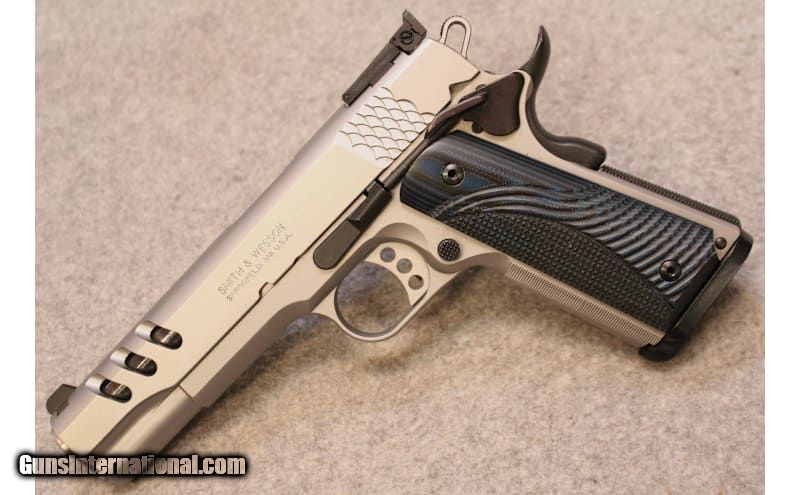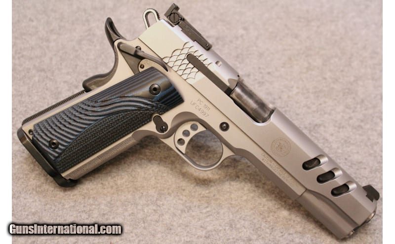 Description: This Smith & Wesson Performance Center 1911 chambered in .45 Auto features, stainless finish, target sights, slide cuts, ambidextrous thumb safety, checkered mainspring housing/front strap, flared magwell, and G10 checkered grips. .45 Auto SOLD Barrels: 5 Weight: 2.5 lbs. Item Location: Hoffman Estates, IL |
