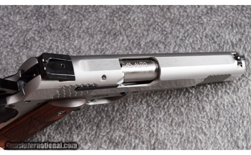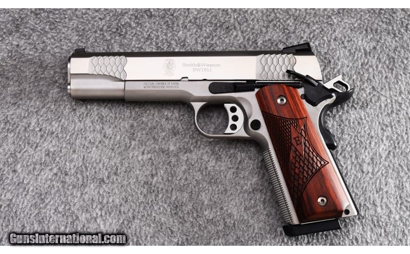 Description: This Smith & Wesson SW1911 in .45 Auto is an "E" series model. It features scale style cocking serrations on the front and rear of the slide as well as a ribbed flat top. The flat sides are polished stainless steel. Oversize external extractor. This pistol has standard three dot white sights. The original factory blue S&W box and two (2) magazines are included. A very nice 1911. .45 Auto SOLD Metal Condition: Excellent Wood Condition: Excellent Bore Condition: Excellent Barrels: 5 Triggers: Factory Three Hole Butt Pad: Two Panel Wood Grips - E Series Weight: 40 oz Sights: Three Dot White Item Location: Wheeling |