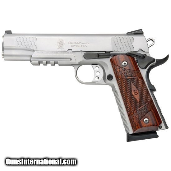 Description: Guns Listing ID: 54036 Smith Wessons premium version of the classic 1911 the SW1911 E-Series is a line of single-action semi-automatic handguns chambered in 45 ACP with an 81 capacity and a frame constructed from steel. The checkered wood laminate grip employs a positive hold and includes a thumb and beaver-tail grip safety. Other features include an external extractor skeletonized hammer and trigger and front slide serrations. The SW1911 E-Series is suitable for personal protection and home defense. Details Action SA - Caliber .45 ACP - Capacity 81 - Finish Stainless - Material Steel - Grip Wooden Laminate E-Series - Sights Tritium Night Sights - Barrel Length 5 - Overall Length 8.7 - Weight 41.5 oz - Precision. Accuracy. Performance. With a remarkable selection of SW1911s Smith Wesson continues its tradition of innovation and its commitment to bringing shooters the finest quality high performance firearms. Smith Wessons variations of John Moses Brownings extremely popular 1911 design can be seen in the production Pro Series Champion Series and Performance Center line of SW1911 pistols. These 1911s are manufactured with a wide variety of materials finishes and unique features and are favorites in any collection. SOLD Manufacturer: SMITH & WESSON Model: SW1911 E SERIES RAIL Caliber Info: 45 ACP Condition: new Barrels: 5 BARREL |