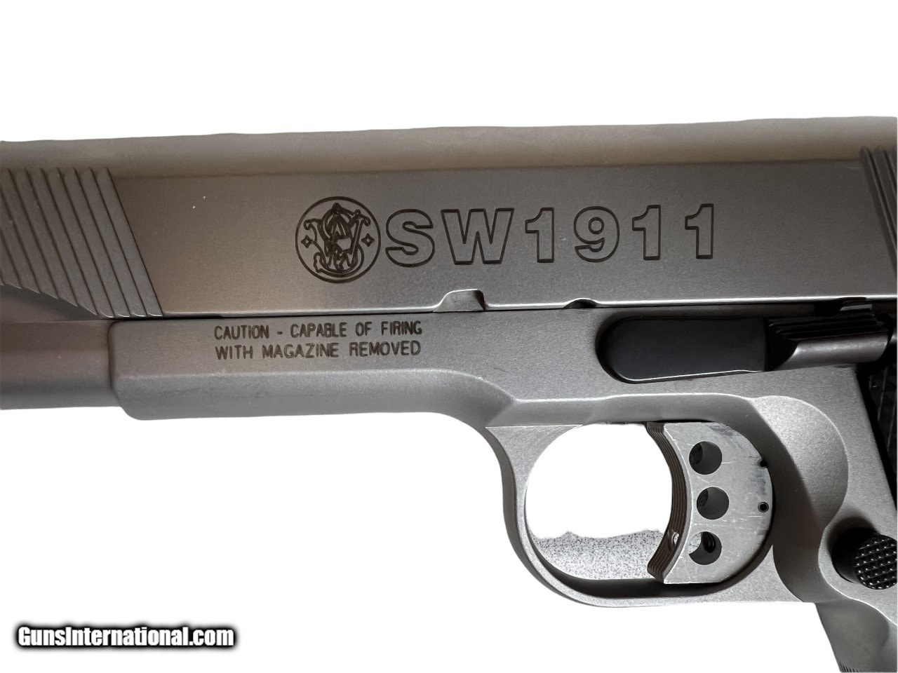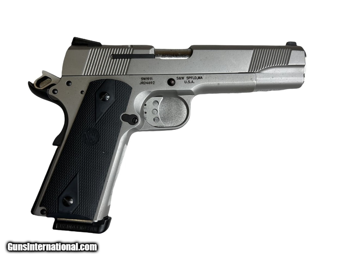 Description: Guns Listing ID: 453367 Smith Wesson premium version of the classic 1911 the SW1911 a line of single-action semi-automatic handguns chambered in 45 AUTO with a frame constructed from steel. A positive hold and includes a thumb and beaver-tail grip safety. Other features include an external extractor skeletonized hammer and trigger and front slide serrations. The SW1911 is suitable for personal protection and home defense. ITEM# I01018412 SOLD Manufacturer: SMITH & WESSON Model: SW1911 Caliber Info: 45 ACP Condition: Used - Non-Certified Barrels: 5 BARREL |