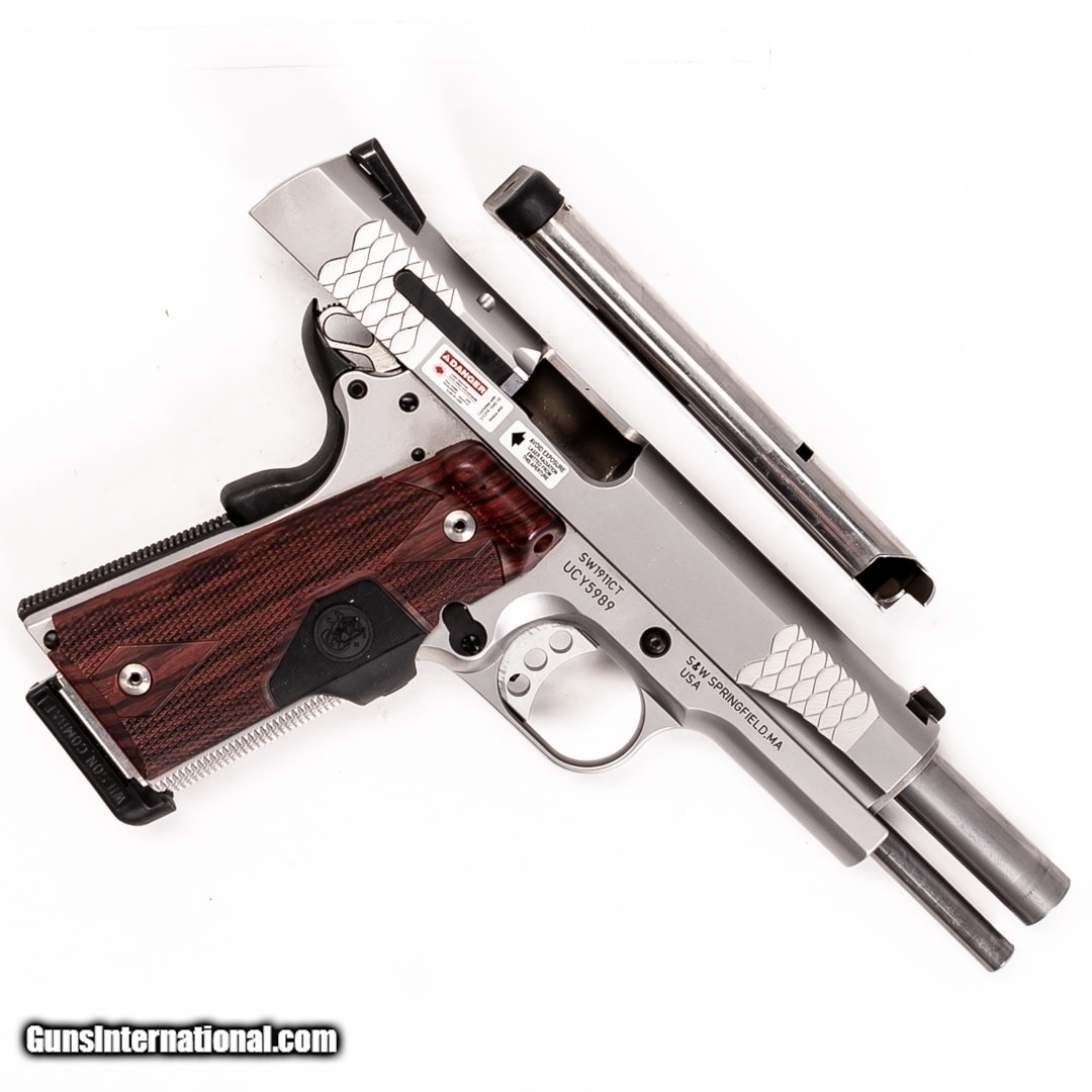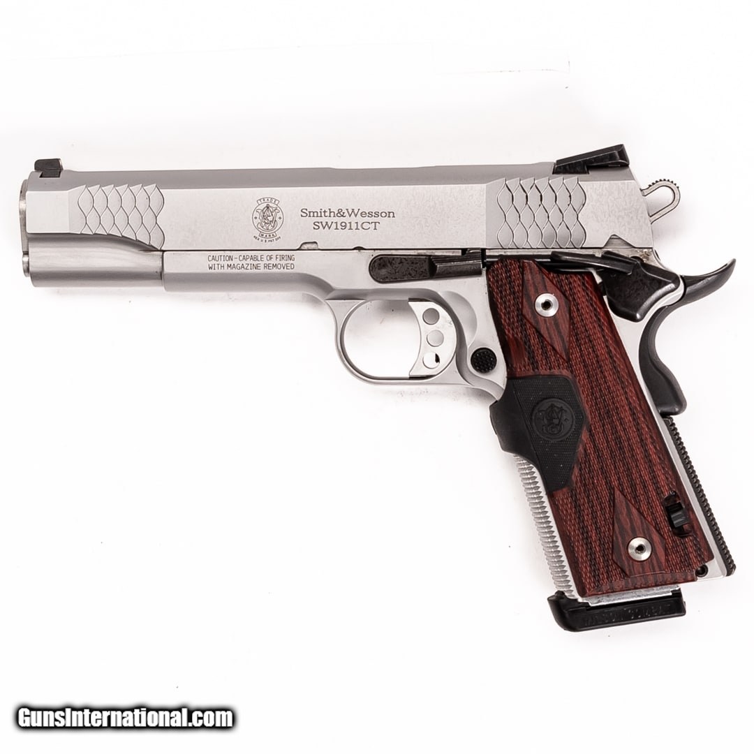 Description: Guns Listing ID: 332423 The Smith & Wesson SW1911CT Series is a stainless-steel variant of John Browning's original Colt 1911 that incorporates a Crimson Trace laser in the grips. Well made, affordable, and dependable, this is a great big bore self-defense sidearm. Ships with two 8-round magazines and the condition is almost new. SOLD Manufacturer: SMITH & WESSON Model: SW1911CT Caliber Info: .45 ACP Condition: Used - Certified Barrels: 5 BARREL Finish: STAINLESS |