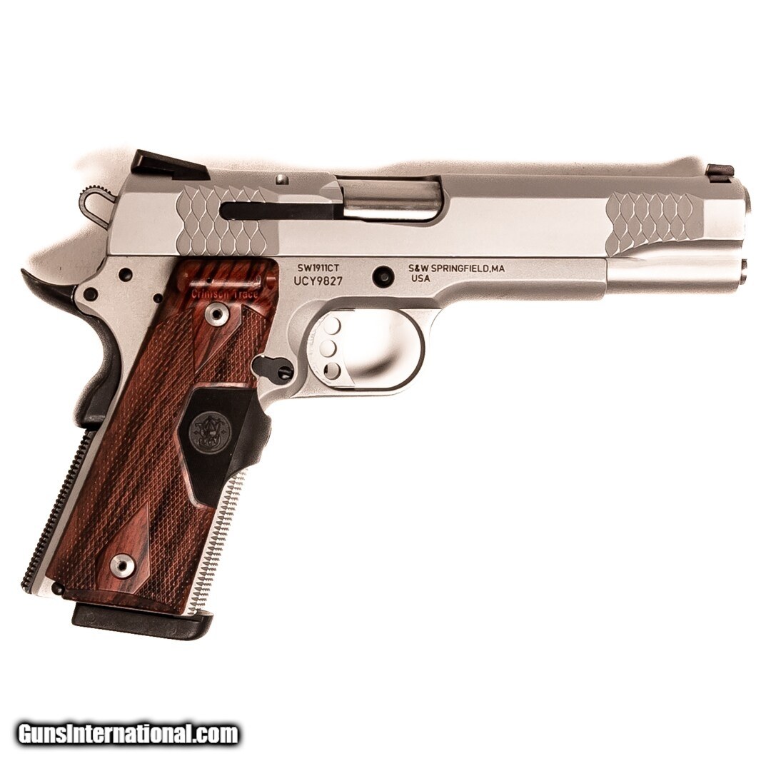 Description: Guns Listing ID: 733727 The Smith & Wesson SW1911 is a stainless-steel pistol patterned off John Browning’s original Colt 1911. Well made, accurate, and dependable, this is a great big bore self-defense sidearm. This SW1911CT features a safety and Crimson Trace laser grips. The original case, manual, and one 8-round magazine are included. Get the best bang for your buck when you get a Certified Used Firearm . When you see the Certified Used stamp on any of our firearms, you can be confident that you’re getting exactly what you want – a gun only in very good to excellent condition and held to the highest quality standard. All Certified Used Guns come with a ‘no questions asked’ return policy . PLUS, ALL CERTIFIED USED GUNS SHIP FREE! SOLD Manufacturer: SMITH & WESSON Model: SW1911CT Caliber Info: .45 ACP Condition: Used - Certified Barrels: 5 BARREL Finish: STAINLESS |