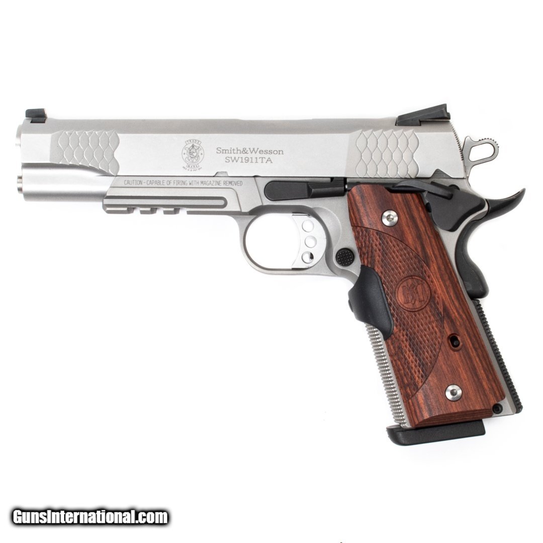 Description: Guns Listing ID: 544849 This Smith & Wesson 1911 comes with two 8-round magazines, the original case, owner‚s manual, and it‚s equipped with Crimson Trace Cocobolo red laser grips and Trijicon night sights. Get the best bang for your buck when you get a Certified Used Firearm . When you see the Certified Used stamp on any of our firearms, you can be confident that you’re getting exactly what you want – a gun only in very good to excellent condition and held to the highest quality standard. All Certified Used Guns come with a ‘no questions asked’ return policy . SOLD Manufacturer: SMITH & WESSON Model: SW1911TA Caliber Info: .45 ACP Condition: Used - Certified Barrels: 5.00 BARREL Action: SEMI AUTOMATIC Finish: stainless Weight: 2.4 |