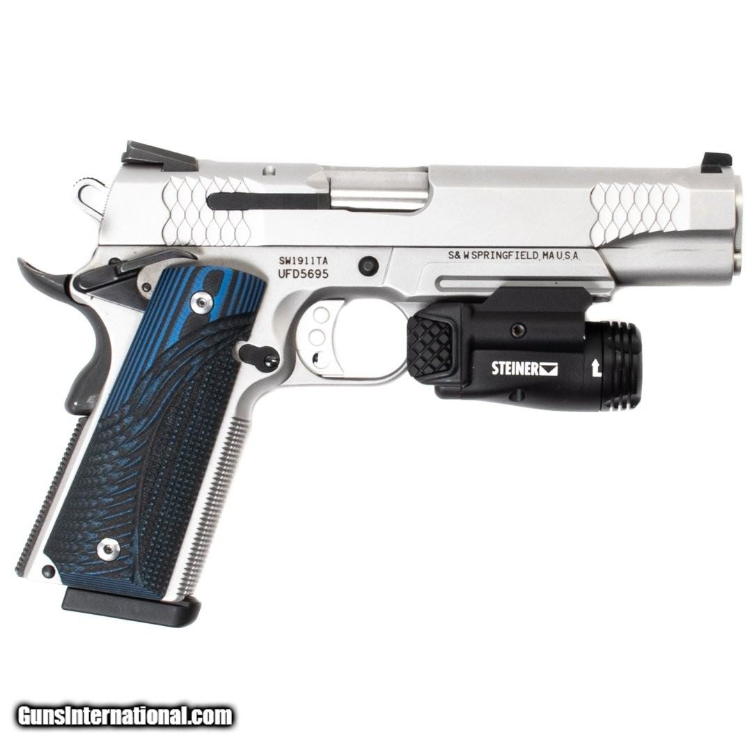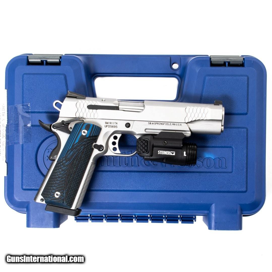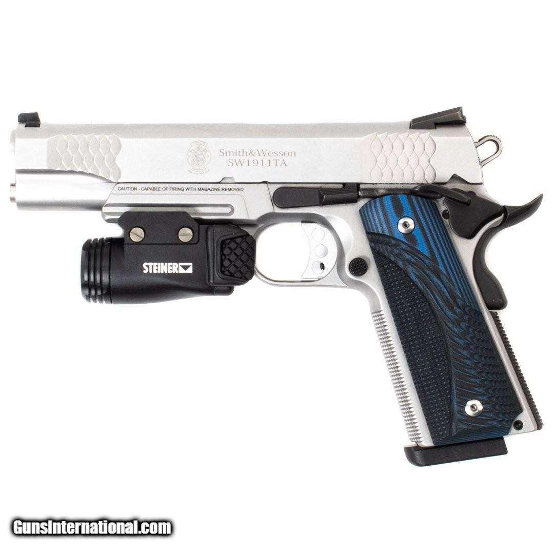 Description: Guns Listing ID: 572337 This Smith & Wesson 1911 comes with one 8-round magazine, the original case, owner‚s manual, an ambidextrous safety, a Steiner Tac light, extra grips, and it‚s equipped with night sights. Get the best bang for your buck when you get a Certified Used Firearm . When you see the Certified Used stamp on any of our firearms, you can be confident that you‚re getting exactly what you want – a gun only in very good to excellent condition and held to the highest quality standard. All Certified Used Guns come with a ‚no questions asked‚ return policy . SOLD Manufacturer: SMITH & WESSON Model: SW1911TA Caliber Info: .45 ACP Condition: Used - Certified Barrels: 5.00" BARREL Action: SEMI AUTOMATIC Finish: stainless Weight: 2.8 |