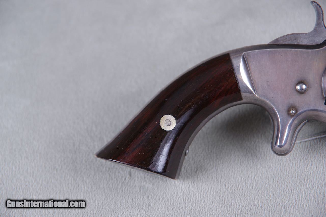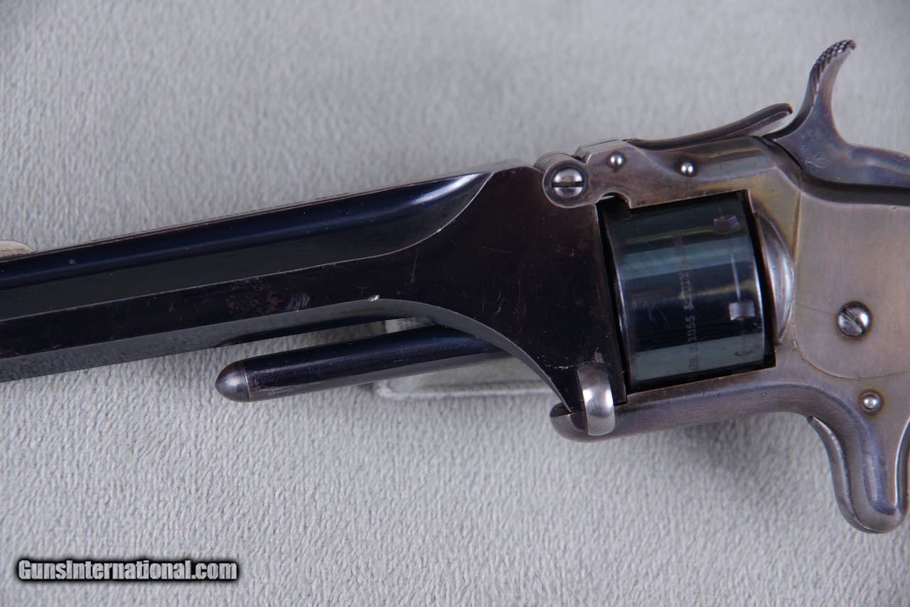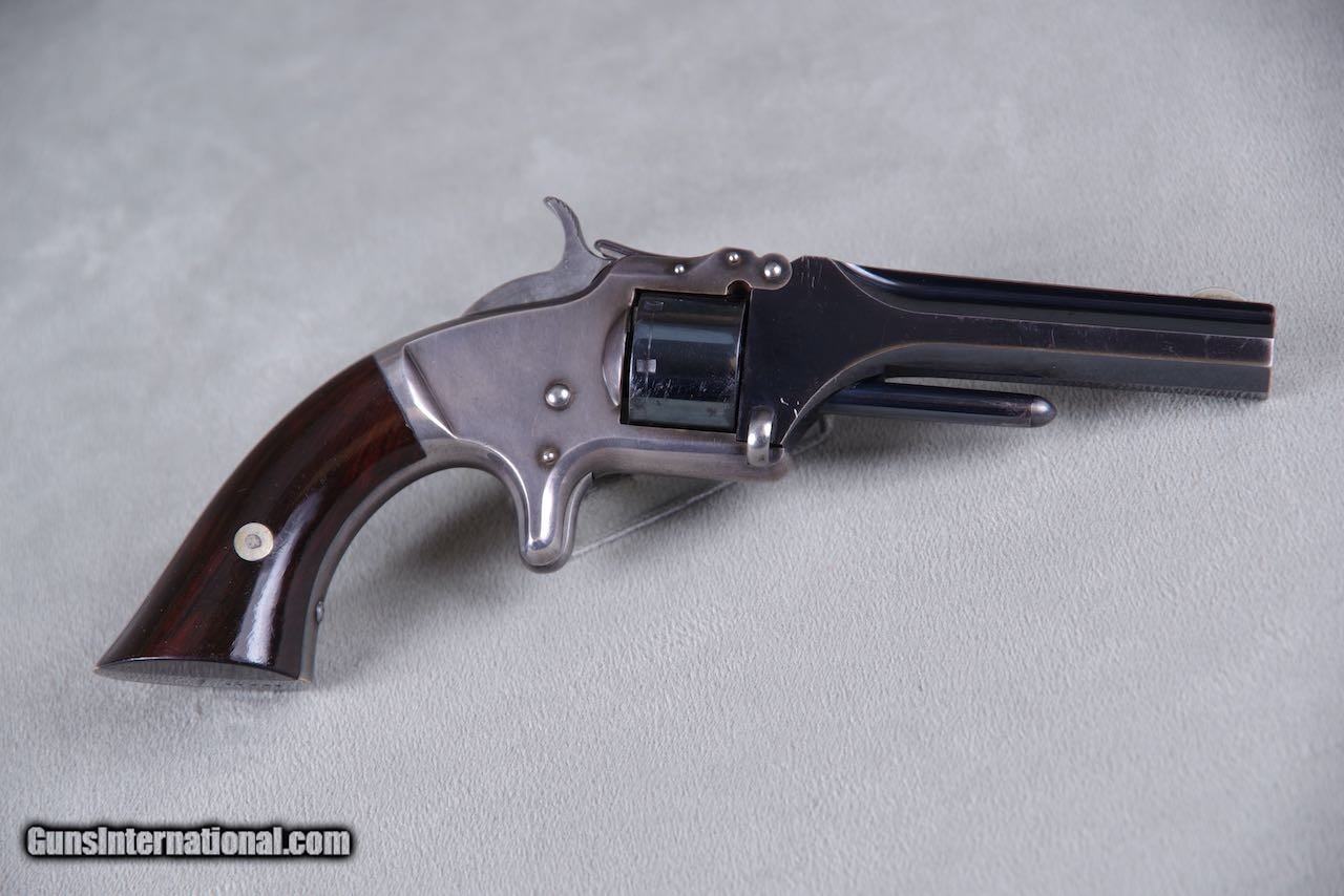 Description: Smith & Wesson Model No. 1 2nd issue. This revolver was manufactured between 1860 and 1868. It is chambered in 22 rimfire and has 3 3/16''' barrel. The barrel and cylinder are blue and the frame is silver plated. There are matching assembly marks on the grip frame barrel and cylinder. The right grip panel is numbered to the gun. The action cycles perfectly. The bluing rates 95%. The original silver plating has aged darkened a little and overall it rates 98%. The grips are also in excellent condition with minor handling marks and nearly all of the original varnish remaining. This will be a very tough example to upgrade. SOLD Antique: Yes Manufacturer: smith & wesson Model: 1 |