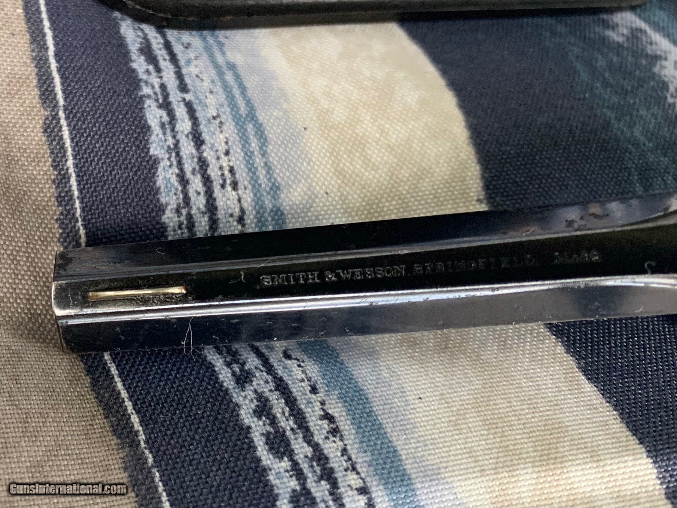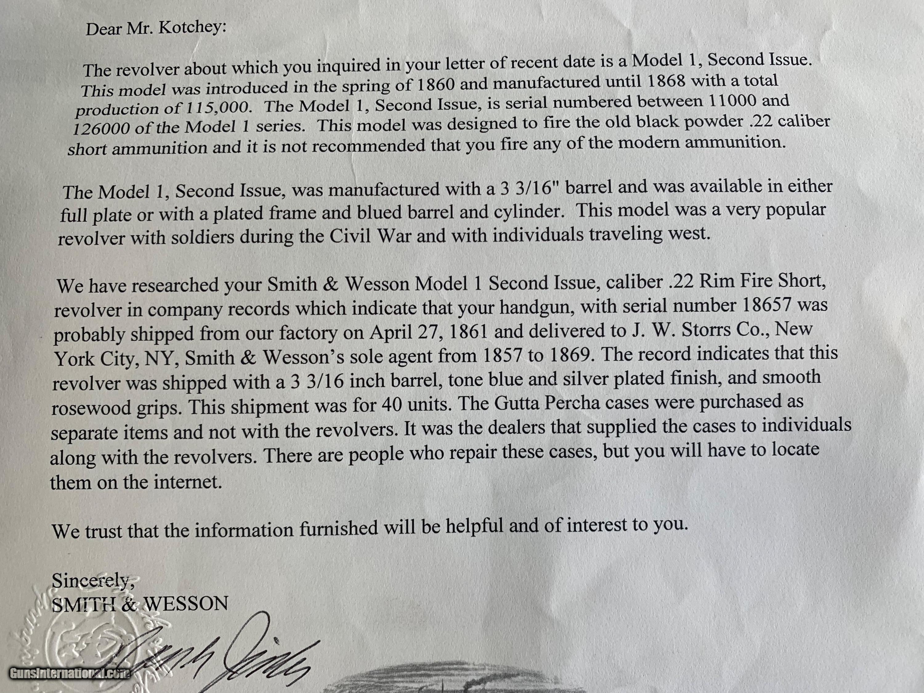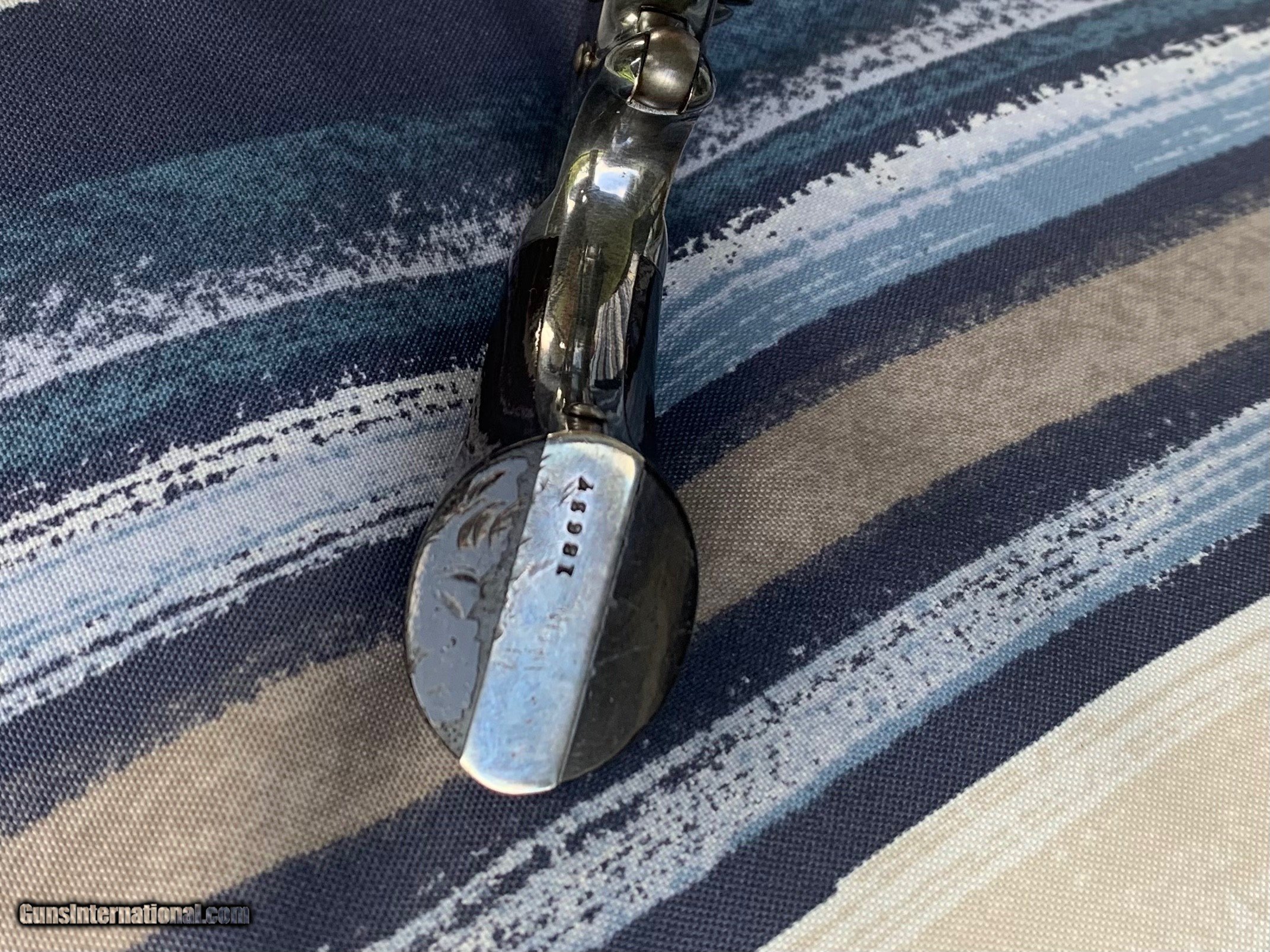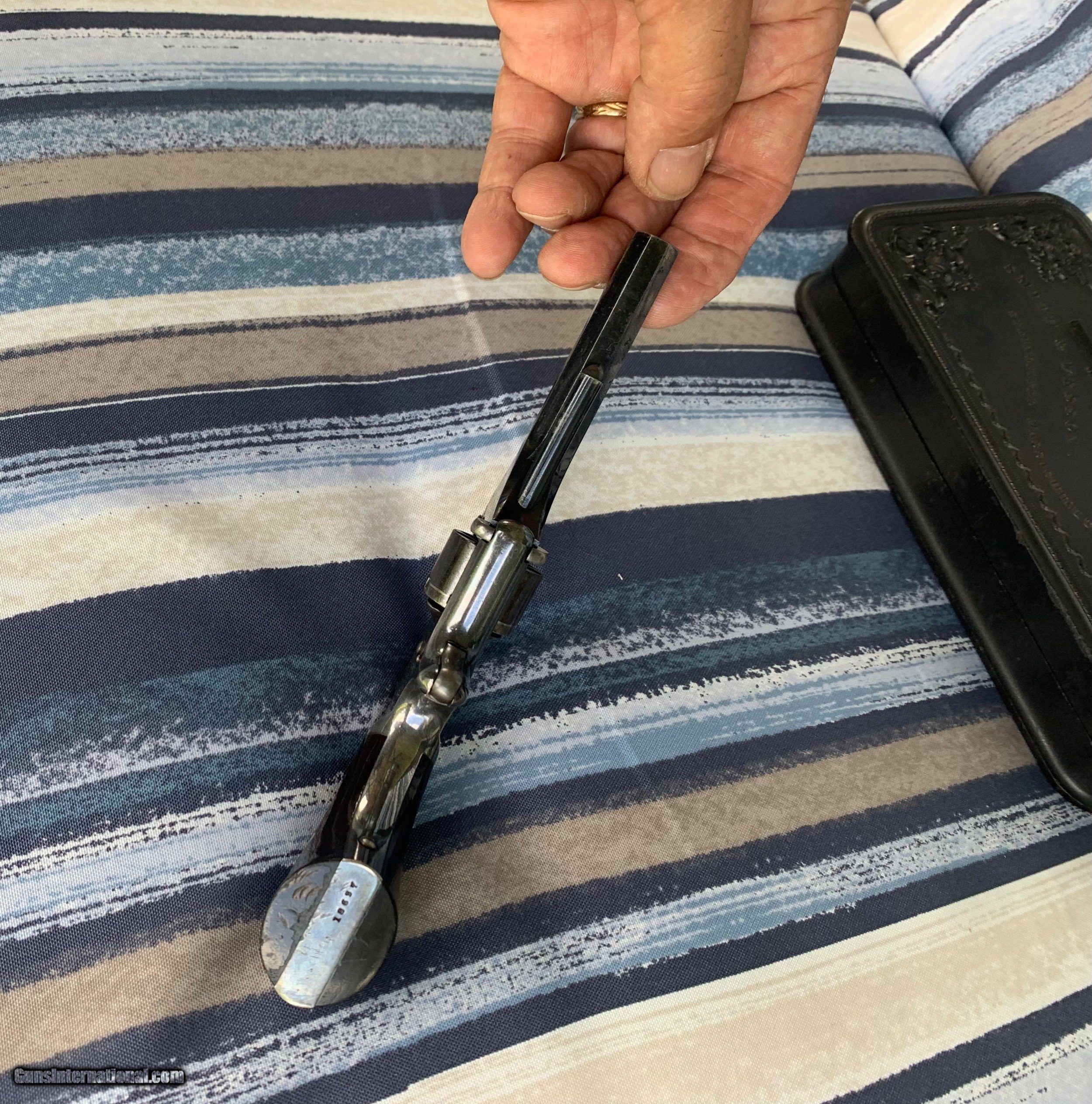 Description: Here's a Near Mint S&W No. 1 revolver in 22 caliber with original GUTTA PERCHA Case. With original 22 ammo and tool ! Serial number 18,637. Manufactured from 1860 to 1868 . Factory "2D Quality " gun has a blued barrel and a Siver Finish frame. Grips are Mahogany Wood grips. Gun has virtually all its original factory finish flaking a bit on hinge area. Factory Luster Blue is solid and bright. Gun has all its original solid Silver finish still remaining on back half of gun . Wood grips are mint and 100 percent factory original! This is a stunning example of a Early period S&W 22 revolver with a super rare case! Case has been professionally repaired on bottom half only and done very well . Overall case is in excellent plus condition! Original ammo still in place and original cleaning rod is with case . Great piece of American History ! The condition is fantastic . Please review my photos and please email me with any questions ? 3 day inspection as allways. Thank you for looking Little Jo SOLD Antique: Yes Manufacturer: S&W Model: No. 1 Serial Number: 18,637 Condition: Mint |