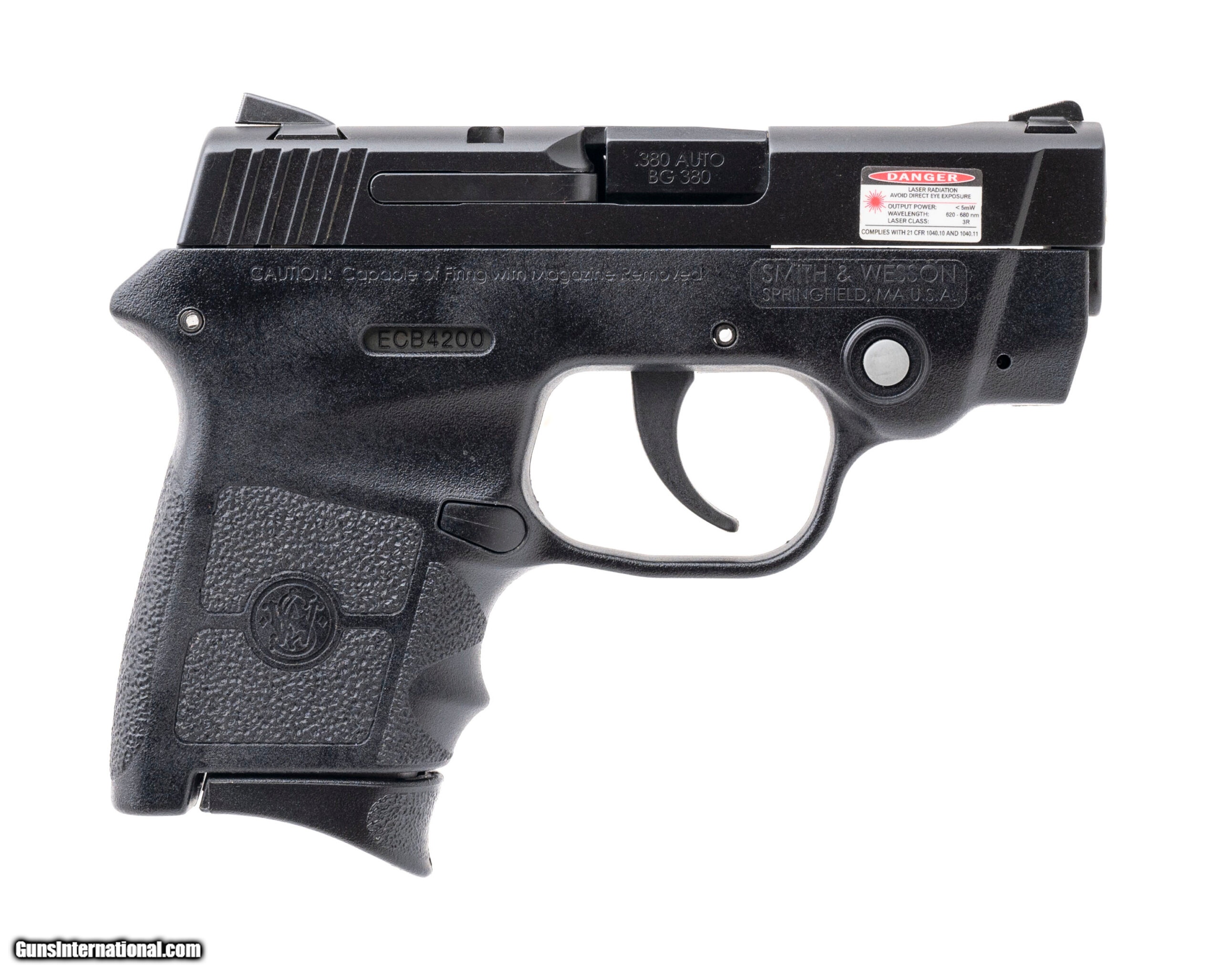 Description: "SN: ECB4200. Modern production, .380 Acp with an 2.6"" barrel. Bore is bright with strong rifling. Micro-compact double action only pistol with an integrated Insight laser. Finish is very good. Polymer frame is very good. Comes with S&W carry bag. SOLD |