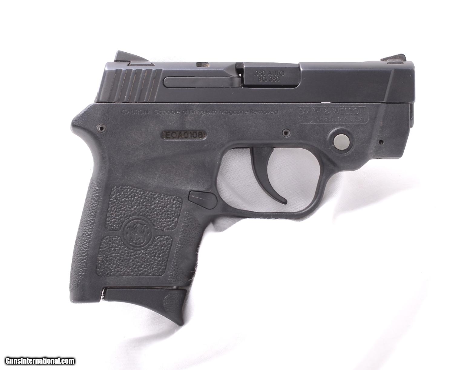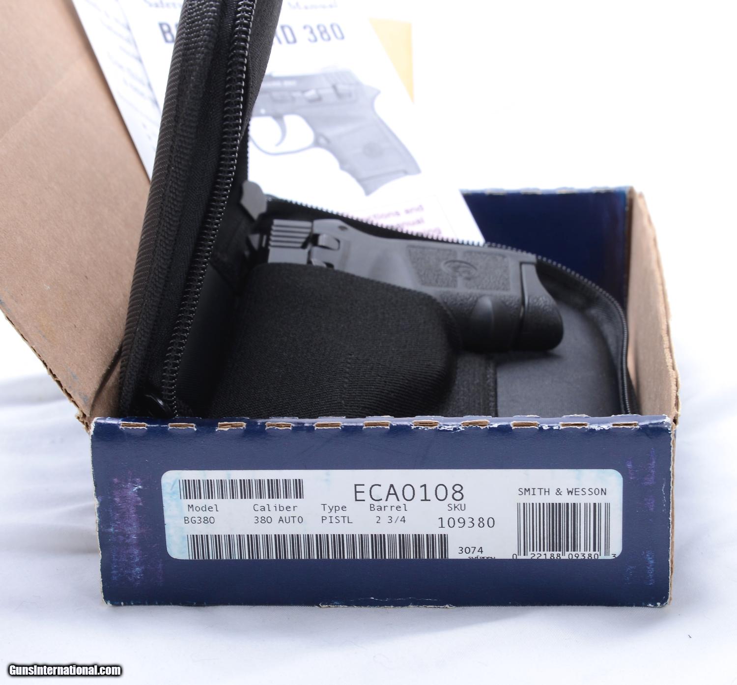 Description: SALE PENDING S&W Body Guard .380 (BG380) pistol with laser. S&W's answer to the smallest, lightest conceal carry pistol is this .380. 98%+ overall condition (test fired only). The laser has a constant mode, a pulse mode and off. Comes with zipper pouch and in the original box with paperwork. SOLD |