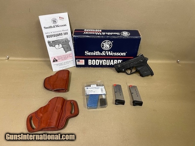 Description: Guns Listing ID: 1108642 SMITH & WESSON MODEL - BODYGUARD CALIBER - .380ACP VERY GOOD CONDITION 2 MAGS 6 + 1 2.75\" BARREL LASER (INTEGRAL) 2 LEATHER HOLSTERS ORIGINAL BOX & MANUAL SOLD Manufacturer: SMITH & WESSON Model: BODYGUARD .380 Caliber Info: .380 ACP Condition: Used - Non-Certified Barrels: 2.75 BARREL |